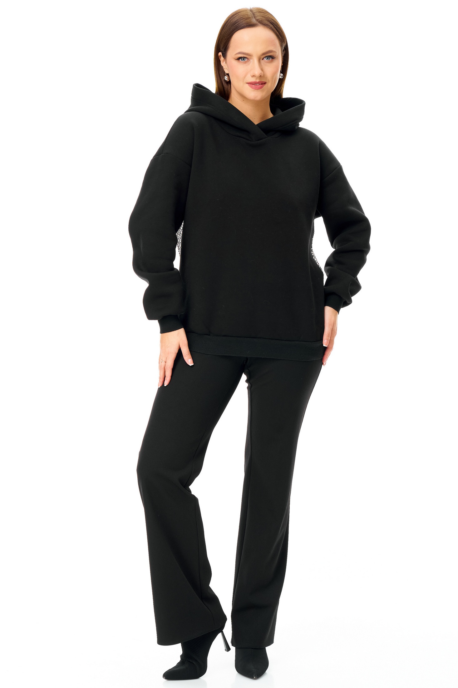 Объемное худи и слегка расклешенные брюки.