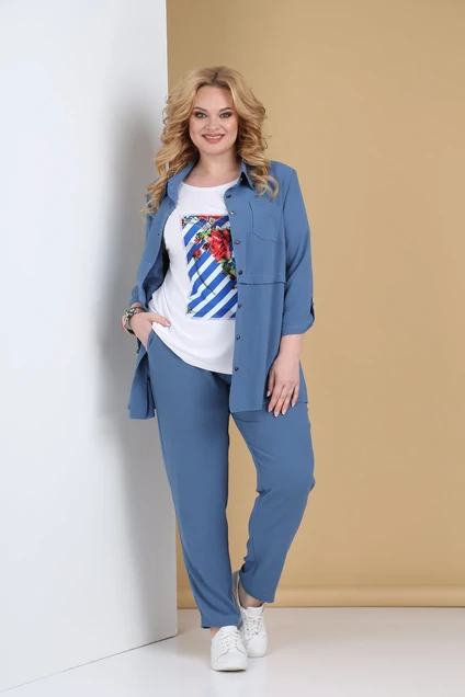 Женский комплект, состоящий из трёх предметов: трикотажная футболка, брюки и жакет.