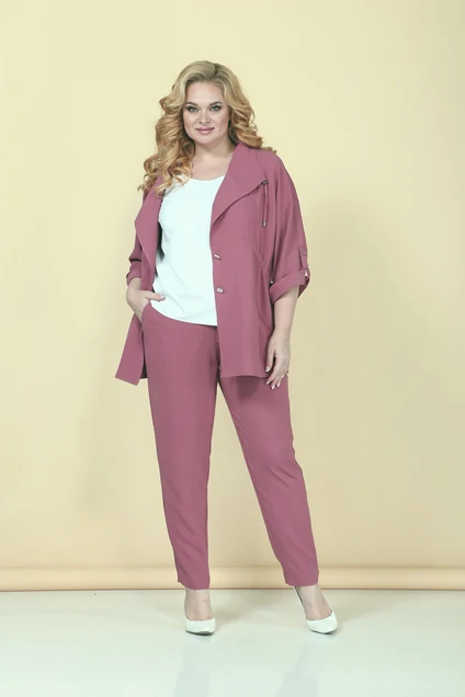 Стильный комплект-тройка, состоящий из жакета-пыльника, брюк и блузы, отлично подойдет для повседневной жизни и отдыха. Жакет свободного силуэта, имеет спущенную линию плеча, с центральной бортовой застёжкой на две петли и пуговицы. На переде обработаны кулисы со шнурками, прорезные карманы с листочками. Спинка длиннее по отношению к переду на 3,5 см. Рукав спущенный, длиной ¾, с отложной манжетой, фиксирующейся патой. Горловина обработана воротником типа "апаш". Отлёт воротника при желании можно присобрать шнурком. Брюки прямые, на притачном поясе с резинкой и протянутым шнурком (из основной ткани). На передних половинках обработаны функциональные карманы. Жакет и брюки выполнены из облегченной стрейчевой ткани с эффектом жатости. Блуза с коротким рукавом и нагрудными вытачками на переде. В боковых швах обработаны разрезы. Отделкой комплекта служит металлическая фурнитура (может отличаться от представленной на фото).
