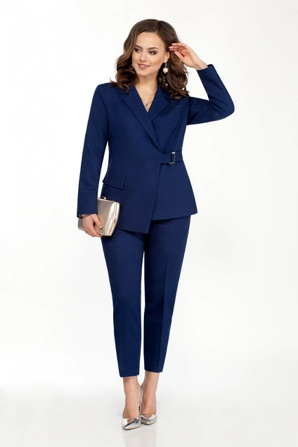 Костюм двойка состоит из жакета и брюк. Жакет полуприлегающего силуэта из костюмной ткани. Пиджачный воротник, клапан справа, рельефы по переду и спинке. Рукав втачной длинный двухшовный. Застежка на потайную пуговицу и пряжку по переду. Жакет на подкладке. Классические брюки прямые с заутюженными складками, зауженные к низу. На передней половине боковые наклонные карманы. Вверху брюки на притачном поясе с резинкой, застежка на «молнию».