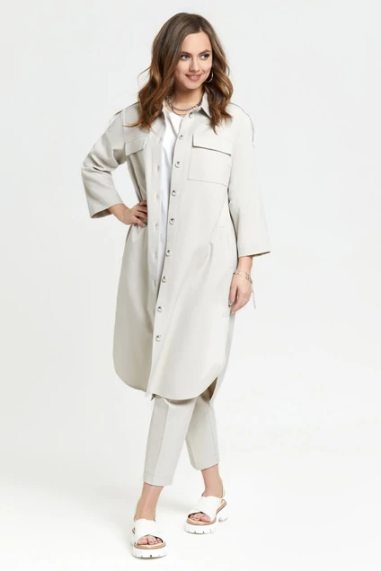 Комплект-двойка из удлиненной рубашки и брюк. Рубашка прямого силуэта в стиле «сафари». Рукав втачной укороченный, по плечу погон переходящий на рукав. Рубашечный воротник, застежка на пуговицы до низа, накладные карманы с клапанами по груди и прорезные с листочками по бедрам. По бокам скругленные разрезы, спинка длиннее переда. По спинке кокетка со складкой. Пояс в комплекте. Брюки прямые с заутюженными складками, зауженные к низу. На передней половине боковые наклонные карманы. Вверху брюки на притачном поясе с резинкой, застежка на «молнию»