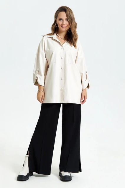 Комплект-двойка из рубашки и брюк. Модная кожаная рубашка свободного покроя. Рукав на спущенной пройме, прямой укороченный, с патой и с отворотом. Рубашечный воротник, застежка на пуговицы. По спинке кокетка. Широкие брюки на поясе с высокой посадкой, с наклонными карманами и заутюженными стрелками. В 56-60 размерах в поясе по бокам дополнительно вставлена резинка. В боковых швах внизу обработаны высокие шлицы. Застежка на молнию и пуговицу.