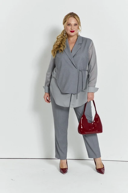 Свободная блуза из двух тканей. Отлетные детали переда с воротником пиджачного типа и с отворотами лацканов. На спинке кокетка и складка. Низ оформлен с закруглениями. Рукава с высокими манжетами на пуговицах. Детали переда подвязываются шнурами.