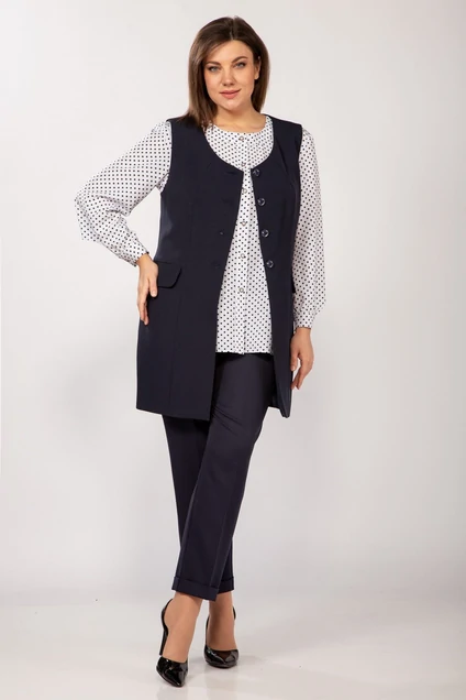 Универсальный офисный комплект из добротного костюмного полотна. Состоит из элегантного удлиненного жилета полуприлегающего силуэта с открытой горловиной, вертикальными рельефными швами, клапанами и комфортными карманами и брюк.