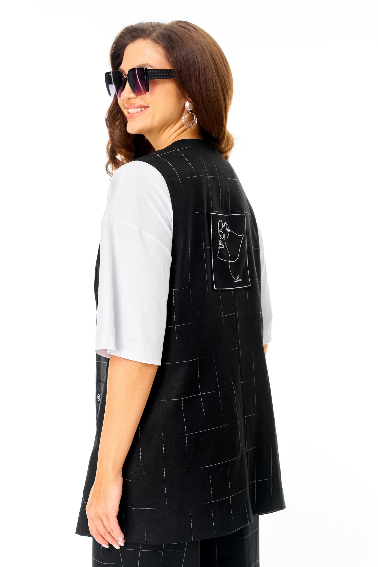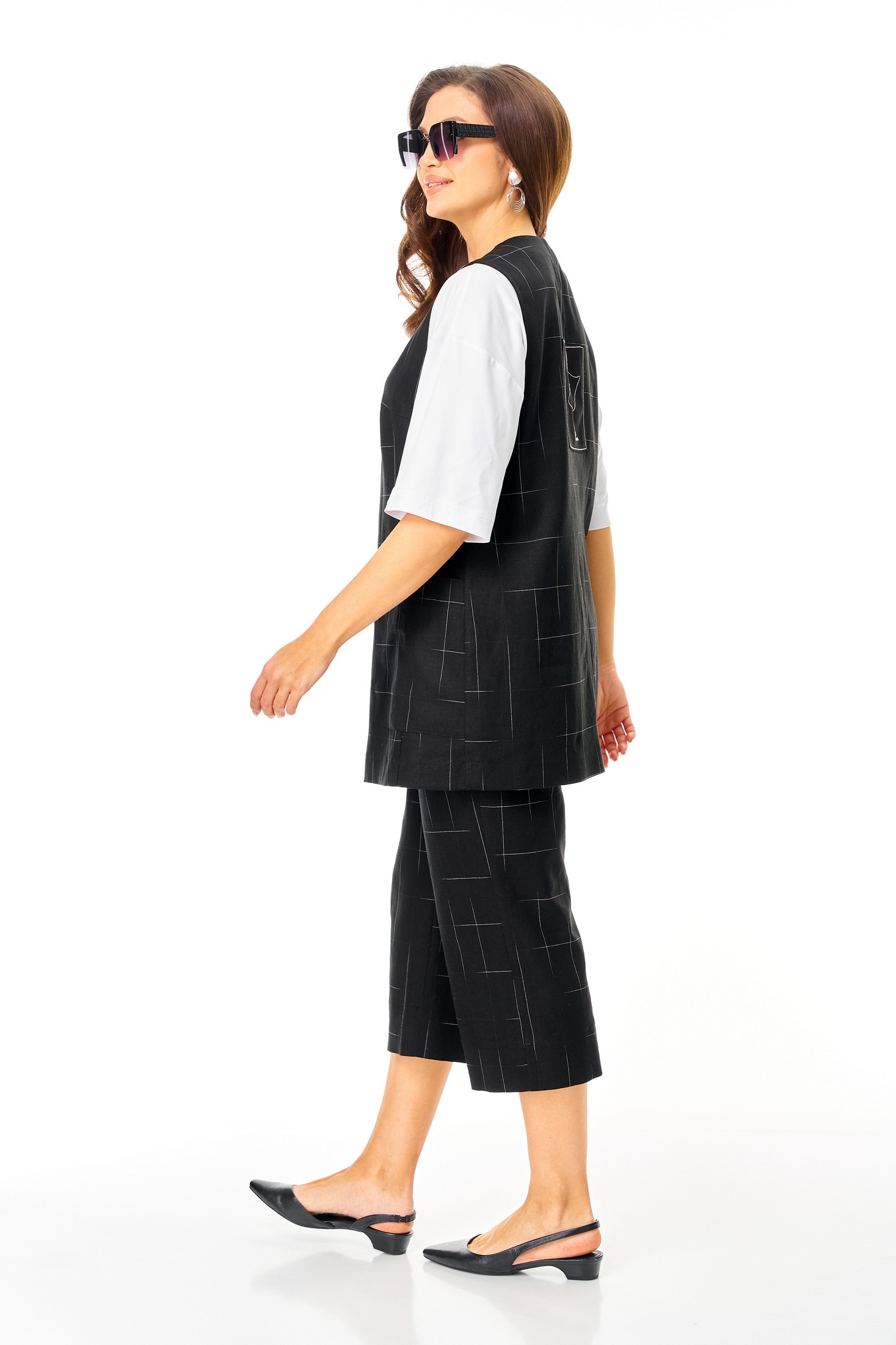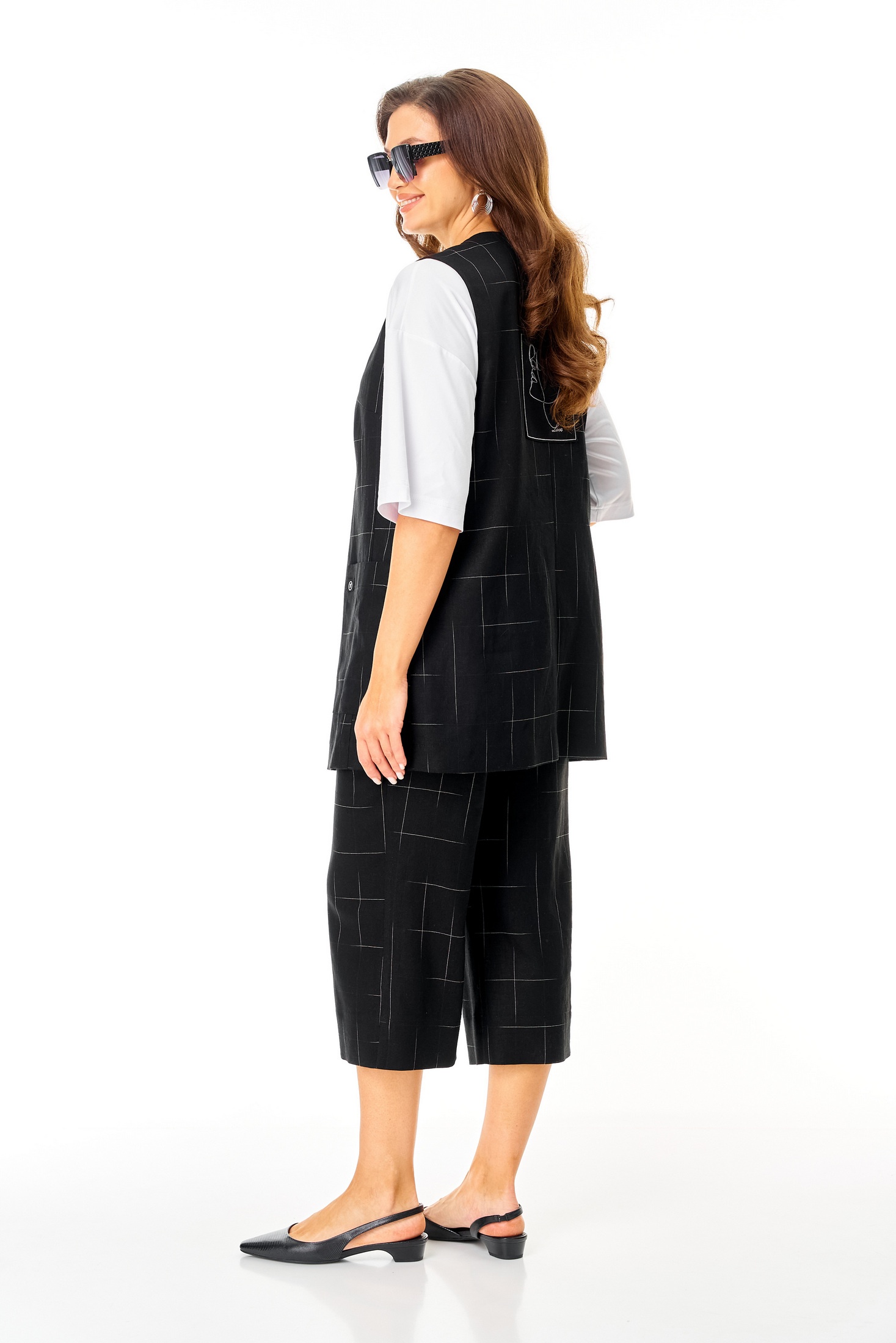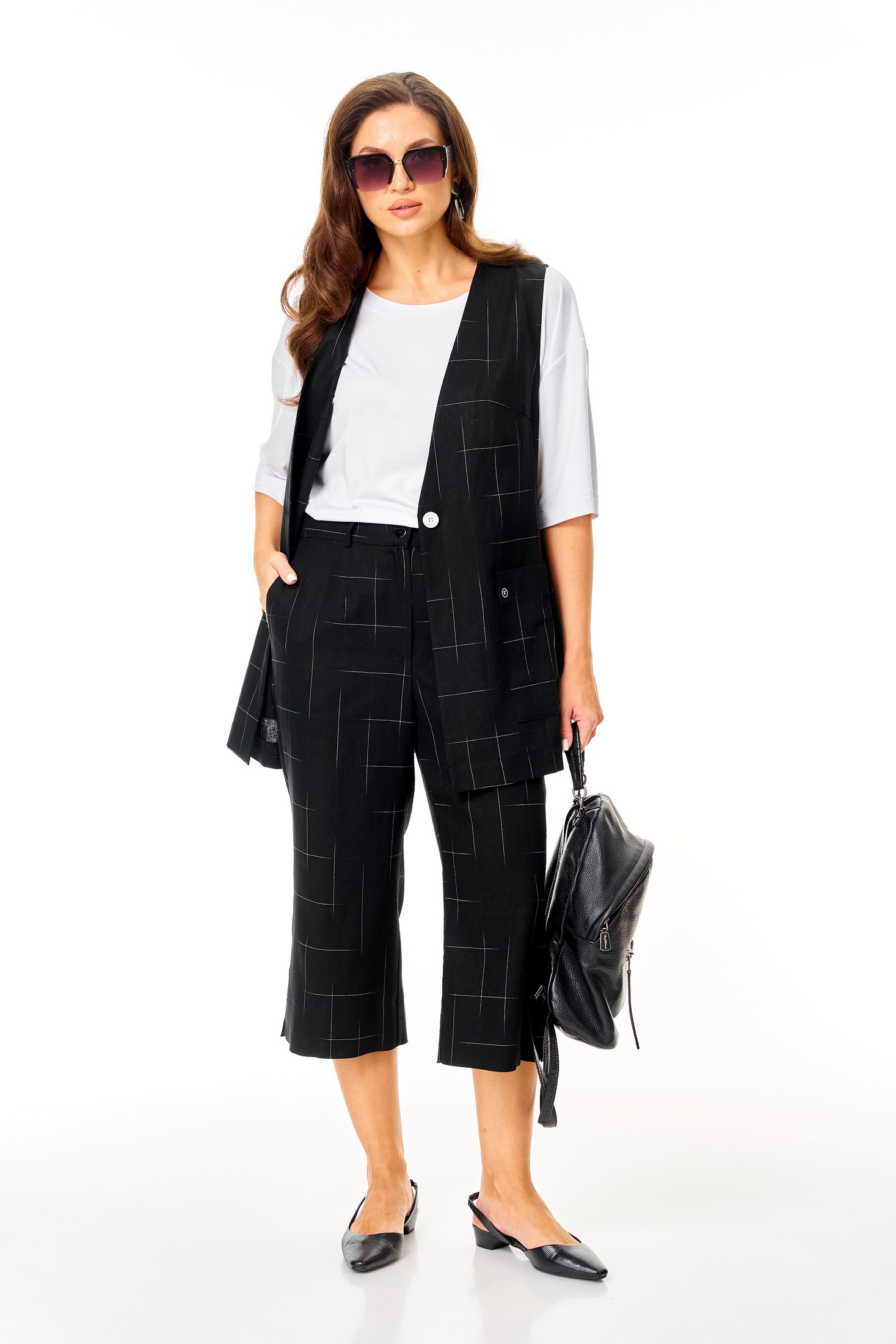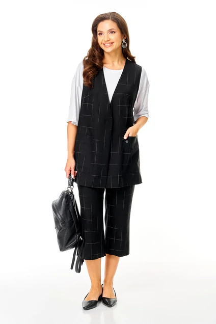 Костюм брючный 7020 черный Tvin привнесет свежесть и оригинальность в ваш гардероб. Коллекция бренда Tvin включает этот элегантный комплет-тройку, состоящий из жилета, брюк и футболки. Жилет и брюки выполнены из льняной ткани с геометрическим рисунком, что идеально подходит для теплых сезонов. Свободный крой брюк с укороченной длиной и карманами добавляет комфорта, а пояс с резинкой обеспечивает идеальную посадку. Футболка из вискозы дополняет образ своим круглым вырезом и короткими рукавами. Черный цвет модели подчеркивает строгость и универсальность, making it suitable для офисного и повседневного стиля. Жилет без рукавов и спущенные плечи футболки придают комплекту современный вид.