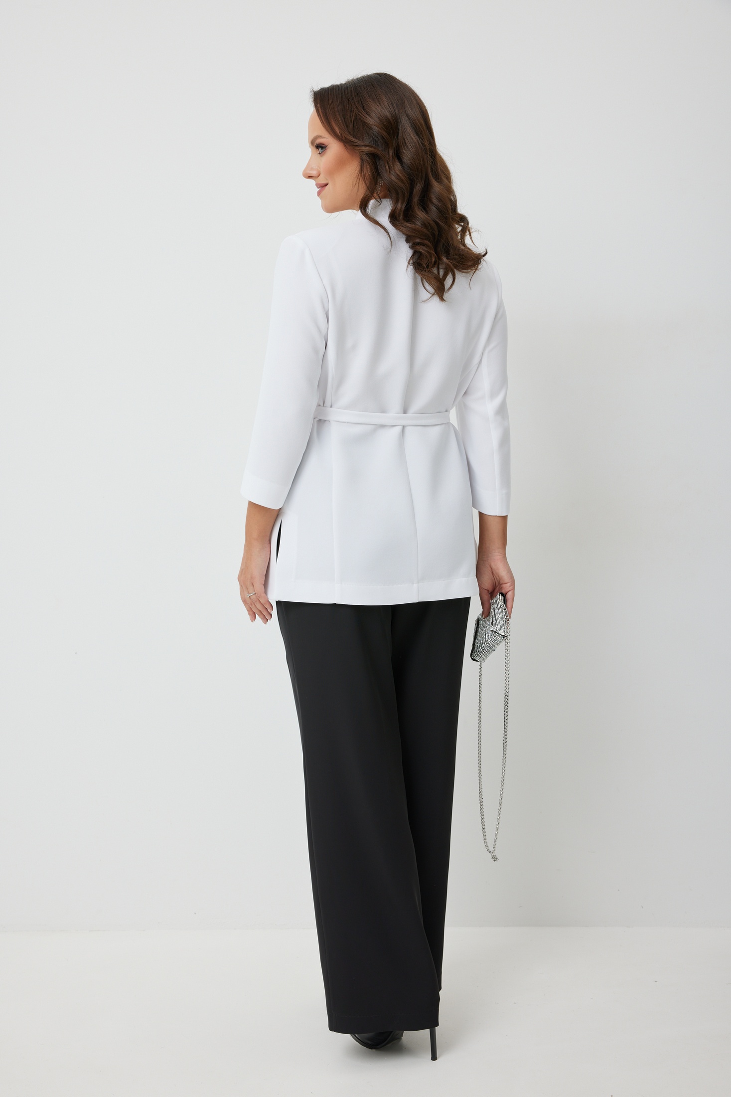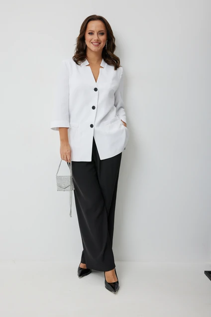 Комплект женский нарядный состоит из жакета и брюк. Жакет полуприлегающего силуэта из однотонной плательно-костюмной ткани, перед изделия на подкладке, центральная застежка на петли и пуговицы. Спинка со средним швом и вертикальными рельефами из проймы. По переду нагрудные вытачки, функциональные карманы с листочкой, декорированные тесьмой из перьев, в боковых швах разрезы. Горловина фигурной формы с плосколежащей стойкой. Рукав втачной двухшовный 3/4 длиной. В комплекте сьемный пояс из основной ткани. Брюки прямого силуэта длинные на поясе, с застежкой гульфик, со складками по переду. В боковых швах функциональные карманы.