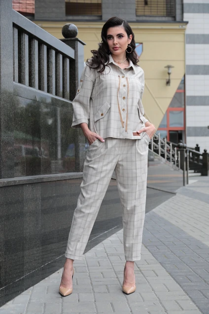 В комплект входят элегантные брюки классического стиля на поясе, с резинкой, с застёжкой на молнию с пуговицей. В боковых швах для удобства расположены карманы, один из которых украшен декоративной тесьмой.