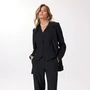 Костюм женский состоящий из жакета и брюк. Жакет на подкладке прямого силуэта с двубортной застежкой на петли-пуговицы.Горловина оформлена воротником пиджачного типа ,рукава двушовные вточные,с функциональными шлицами по низу рукава.Спинка со средним швом. Брюки классической формы прямого силуэта ,со стрелками по передним и задним половинкам Верхний срез брюк обработан поясом с резинкой от бокового шва по задним половинкам.Застежка на тесьму-молнию и пуговицы.В боковых швах карманы.В нижней части боковых швов обработаны шлицы.В комплект входит съемный пояс из основной ткани. Длина жакета 74 см длина брюк 109 см
