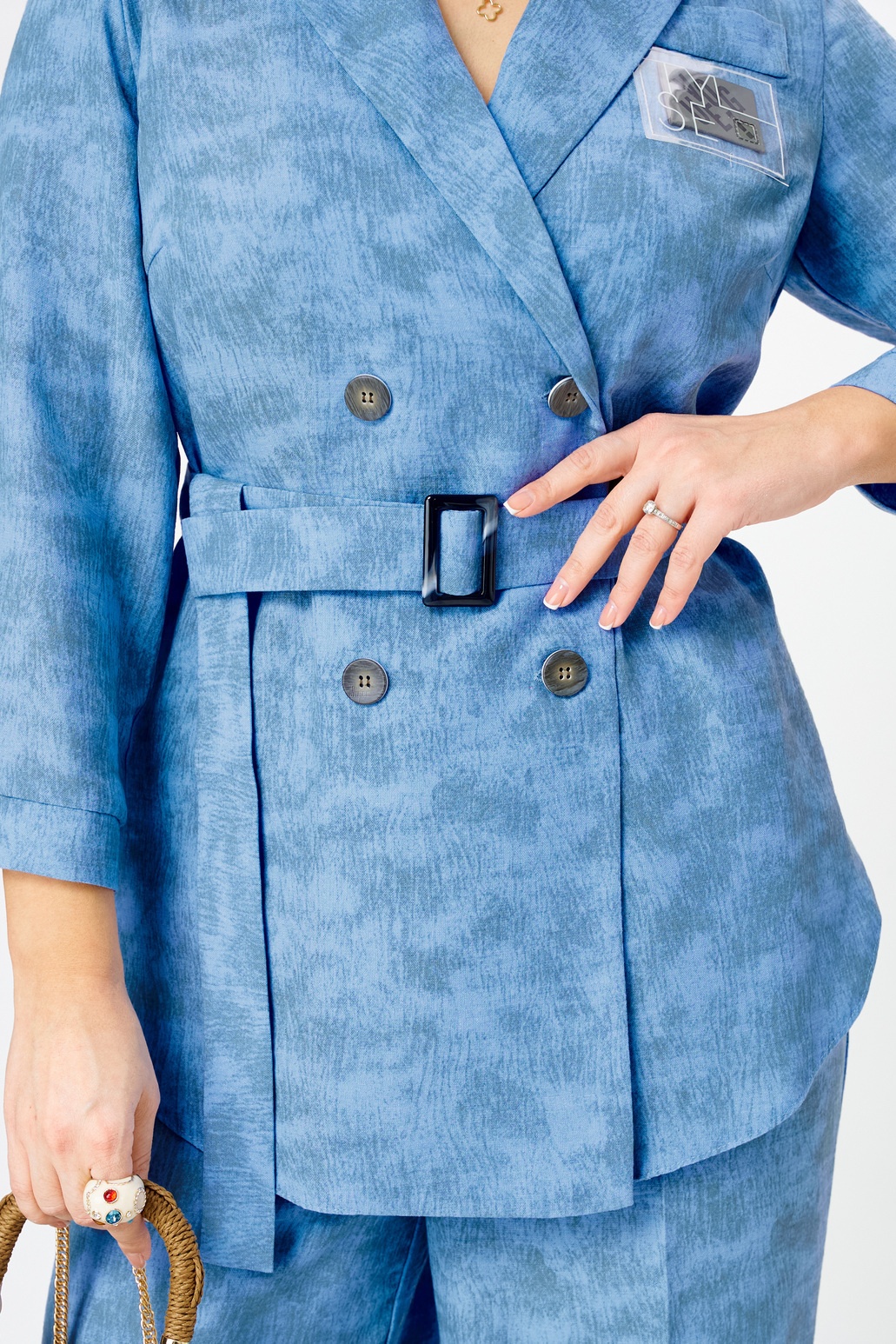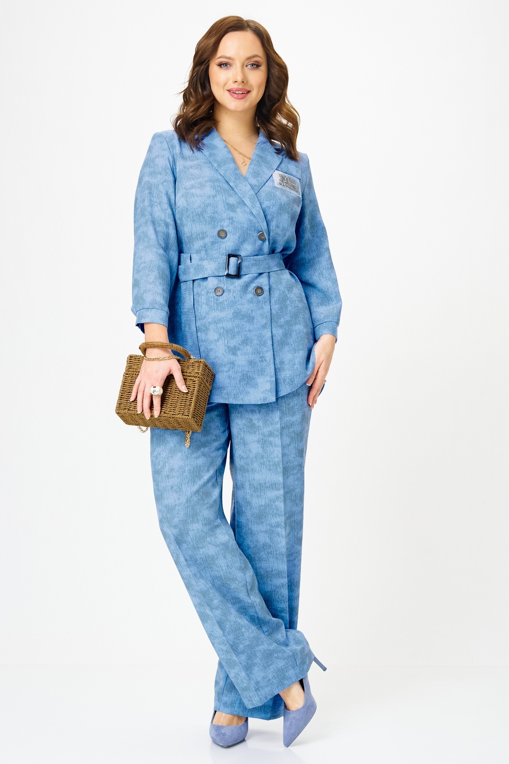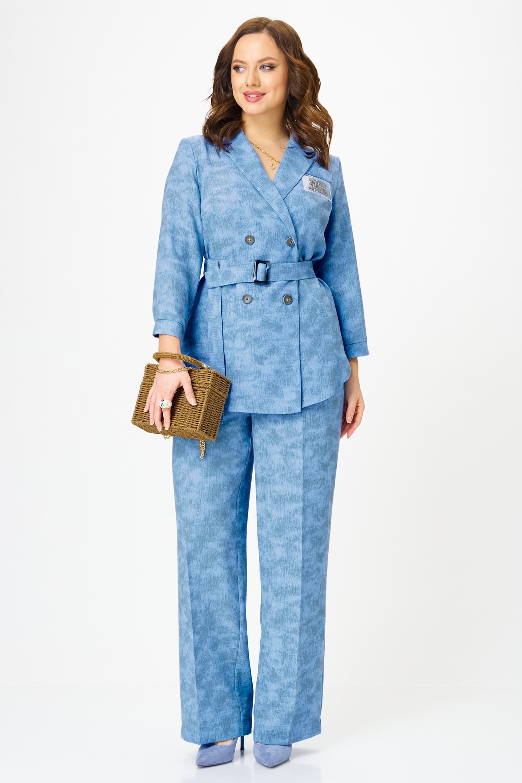 Костюм брючный 2350 голубой с принтом Твой Имидж. Коллекция бренда Твой Имидж объединяет стиль и комфорт в одной модели. Костюм выполнен из качественной поливискозы, что обеспечивает долговечность и комфорт. Жакет с двубортной застежкой имеет длину до середины бедра и украшен декоративной листочкой. Встречная складка на спинке добавляет особый акцент. Брюки классической формы с прямыми линиями, дополнены стрелками и поясом. Наклонные карманы и манжеты на рукавах подчеркивают функциональность. Голубой цвет с принтом идеально подходит для весеннего и осеннего сезонов, предлагая стильный деловой или повседневный образ.