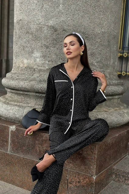 Костюм женский в пижамном стиле ,состоящий из брюк и рубашки. Рубашка с накладным карманам и застежкой центральной на пуговицы.Воротник рубашечного типа, отложной с отрезной стойкой. Рукав короткий , одношовный. Низ рукава оформлен притачной манжетой.