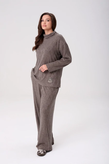 Комплект женский, двойка. Состоящий из джемпера и брюк. Изделие выполнено из трикотажной ткани.Джемпер свободного силуэта. Со спущенной линией плеча. По горловине воротник- стойка, с молнией переходящей в плечо.
