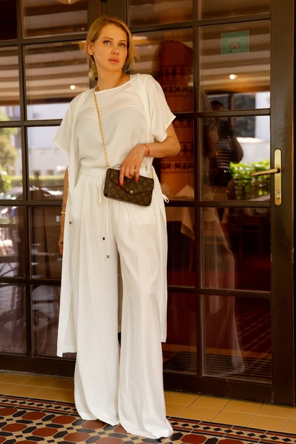 Комплект 3-х предметный (брюки, топ, туника).Туника из вискозной ткани, удлинённая, свободного силуэта. Без застёжки, по линии талии кулиса с завязкой. Спущенная линия плеча.Брюки из вискозной ткани, длинные, широкие, свободного кроя. Боковые карманы. Притачной пояс на эластичной тесьме, кулиса с завязкой.Топ из вискозной ткани, прямого силуэта. Круглая горловина. Длина туника - 112 см.