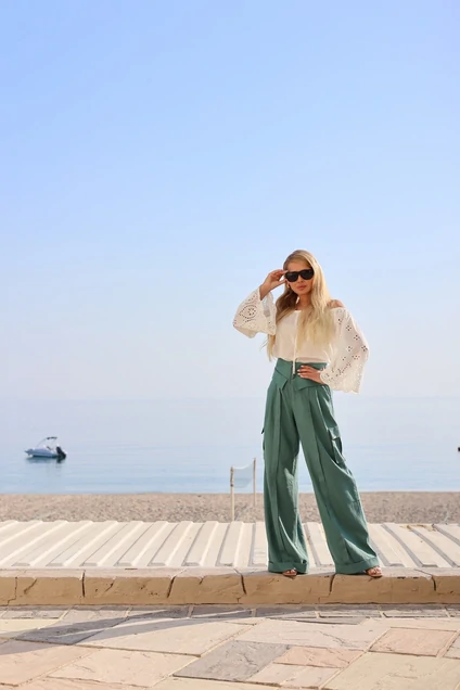 Комплект 2-х предметный: блузка и брюки.Блузка свободного кроя из хлопковой ткани. Верх с открытыми плечами, собран на эластичную тесьму и фиксируется завязкой. Рукав широкий, прямой.Брюки широкие из вискозной ткани. Верх брюк с декоративным отложным элементом. Застёжка по центру переда на молнию. Боковые наклонные карманы. По переду складки. Накладные карманы-портфели. Низ брюк на манжете. Длина 52 см, рукав 50 см. Брюки: 55 % лен, 45 % вискоза.