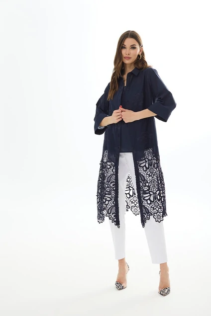 Комплект 3-х предметный, состоит из топа брюк и рубашки. Удлиненная рубаха-туника из хлопковой ткани «шитье». Застежка на переде на петли и пуговицы. Воротник рубашечный. Рукава прямые, длина ¾. Талия фиксируется кулисой с завязками.Топ на бретелях из хлопковой ткани.Брюки, зауженные к низу. Застежка на молнию по переду. Верх брюк на поясе со шлевками. По спинке пояс собран эластичной тесьмой. В боковых швах карманы. Длина 112 см, рукав 44 см. брюки: 72 % хлопок, 26 % ПЭ, 2 % спандекс