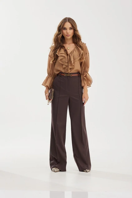 Комплект 2-х предметный: блузка и брюки.Блузка свободной формы. Вырез горловины V-образный. Горловина декорирована двойным воланом и завязкой по переду. Рукава объемные с резинкой понизу. Брюки прямые. Верх на поясе со шлевками. Застежка по переду на молнию и пуговицу. В боковых швах карманы. В комплекте съемный ремень. Рукав 55 см. Модель ремня может отличаться от представленного на фото.