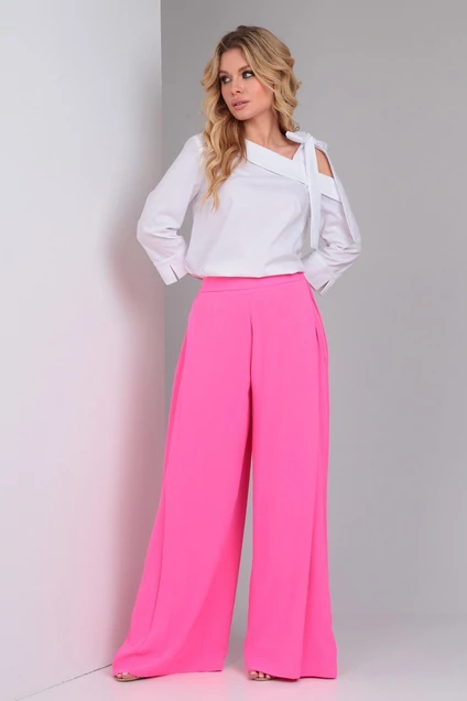 Комплект состоит из блузы и брюк. Блуза женская свободного ассиметричного покроя. В горловину и часть рукава вставлен воротник плоско-лежащего типа. С левой стороны выполнены бретели образующие бант. Брюки расширенного силуэта "палаццо", с застёжкой на молнию и петлю-пуговицу. В боковых швах карманы. В пояс спинки вставлена резинка.