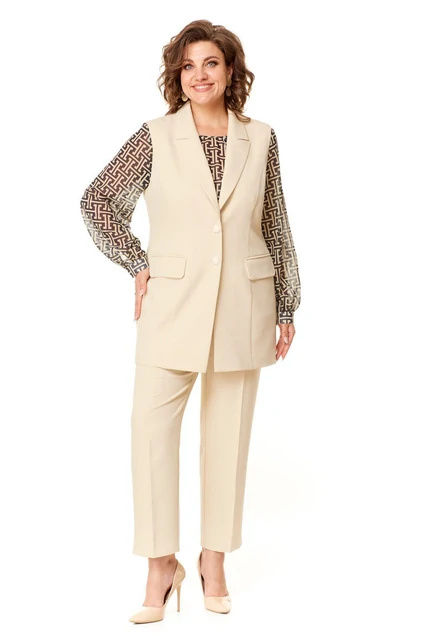 Жилет удлиненный полуприлигающего силуэта на подкладке. Спинка со средним швом и рельефами из проймы. Перед с рельефами из проймы, прорезными карманами "в рамку" и клапанами. Застежка центрально-бортовая на петли пуговицы. Воротник отложной пиджачного типа.