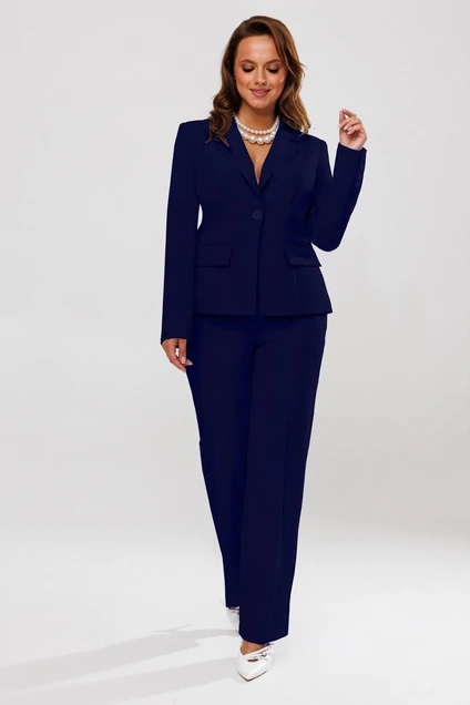 Жакет приталенного силуэта с естественной линией плеча на подкладке. Спинка со средним швом и рельефами из плеча. Перед с рельефами из плеча, прорезными карманами "в рамку" и клапанами. Застежка центрально-бортовая на петлю-пуговицу. Воротник отложной пиджачного типа.
