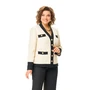 Костюм женский состоит из жакета и брюк.Жакет полуприлегающего покроя с зауженной линией плеча на подкладке.Застежка двубортная петли-пуговицы.По спинке и переду обработаны рельефы выходящие из плеча.Низ борта округлой формы.Воротник типа "шаль".По переду обработаны карманы в подрезах.Рукав длиной 3/4 со складками по окату.Брюки зауженные к низу, с центральной застёжкой на молнию и петлю-пуговицу.В боковых швах карманы с отрезным бочком.Пояс притачной с резинкой по бокам.В комплект входит съёмная металлическая брошь.