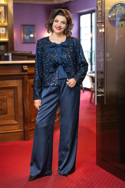 Комплект женский состоит из жакета, топа и брюк.Жакет прямого силуэта свободного покроя с естественной линией плеча на подкладке из атласной ткани.Горловина округлой формы.БАНТЫ СЪЁМНЫЕ!Застежка на съемные декоративные авторские банты с применением потайного крепления на небольшие кнопки, для возможности создания различных образов, как с бантами, так и без них.Топ свободного покроя.Горловина округлой формы.Проймы и горловина окантованы.Брюки свободные расширенного силуэта.По бокам выполнены лампасы из полотна с пайетками.Пояс притачной на резинке.В боковых швах карманы.