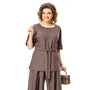 Комплект женский состоит из жакета, топа и брюк. Жакет свободного покроя с естественной линией плеча.Рукав втачной одношовный длиной 3/4 с манжетой из отделочной ткани "пайетки".Перед выполнен из отделочной ткани "пайетки" на атласной подкладке.Обработаны отрезные планки.Застежка центрально-бортовая на петли пуговицы.Воротник отложной типа "шаль".На переде выполнены накладные карманы.Топ свободного покроя из атласной ткани.Горловина округлой формы.Брюки расширенные к низу типа "палаццо" с центральной застёжкой на молнию и петлю-пуговицу.В боковых швах карманы с отрезным бочком.Пояс притачной с резинкой по задней части пояса.В комплект входит съёмный пояс.