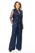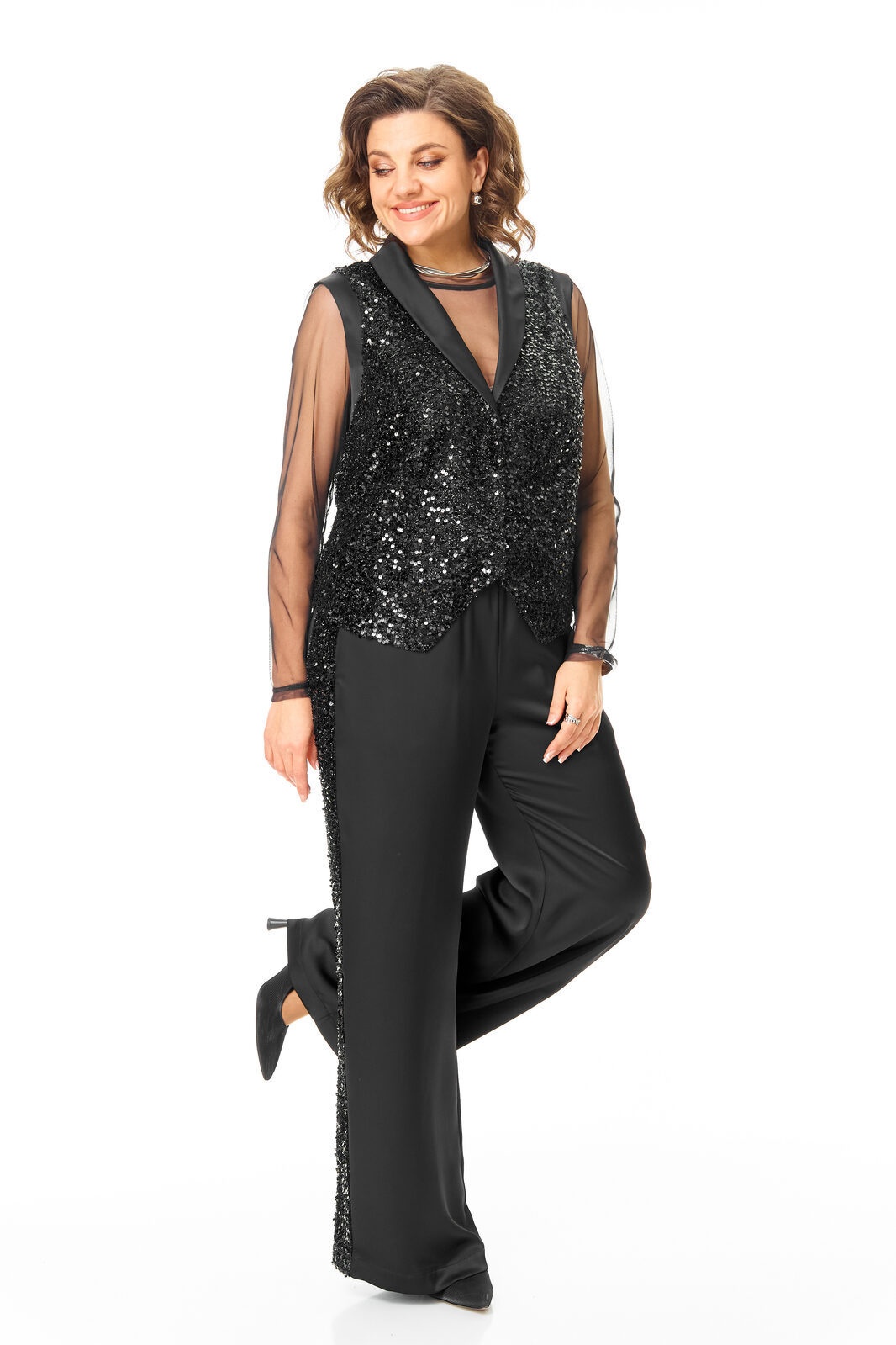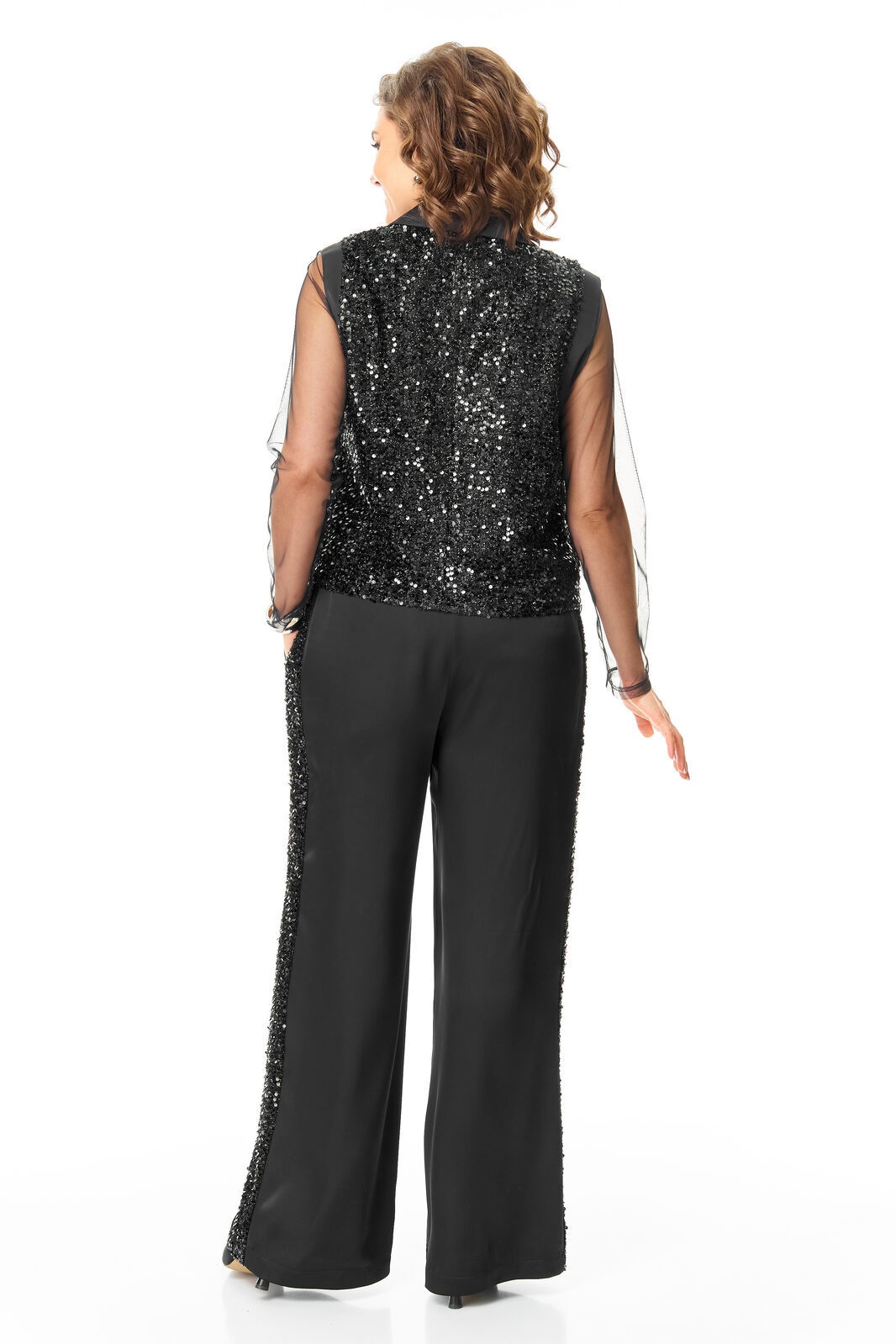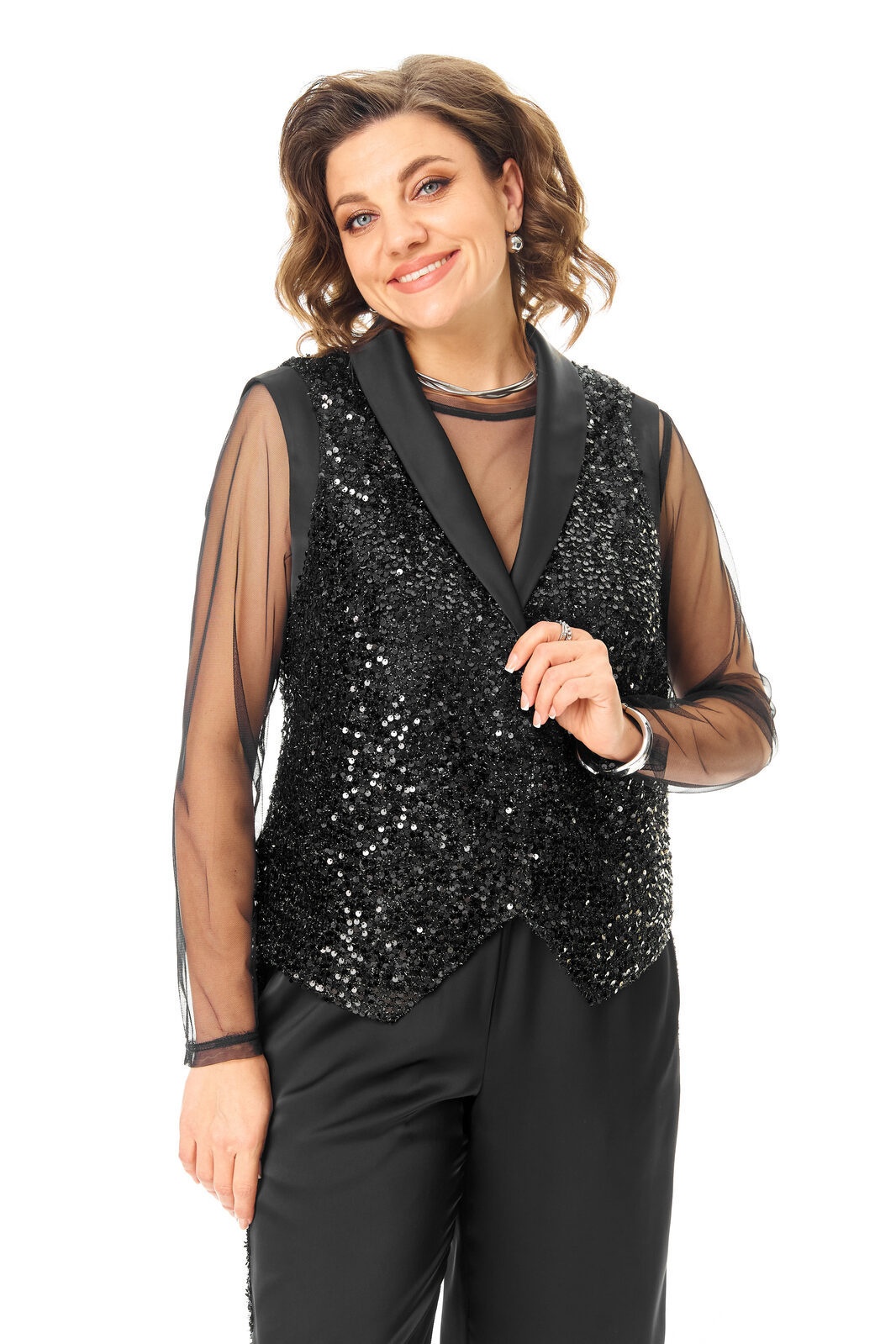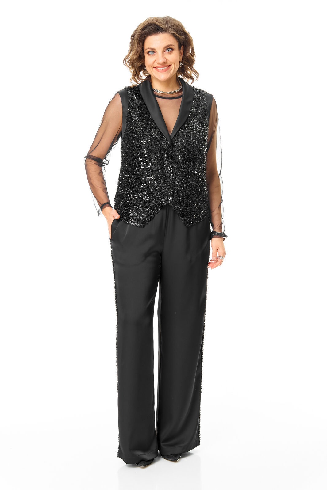 Комплект женский состоит из жилета, топа и брюк.Жилет полуприлегающего покроя на подкладке из шелковой атласной ткани.Перед и спинка выполнены из полотна с пайетками.По проймам выполнены бейки из атласной ткани.Низ жилета фигурной формы.Застёжка однобортная на потайные кнопки.Воротник отложной типа "шаль" из атласной ткани.Топ свободного покроя из полотна сетка.Горловина округлой формы, окантована.Рукав длинный. Брюки свободные расширенного силуэта.По бокам выполнены лампасы из полотна с пайетками.Пояс притачной на резинке.В боковых швах карманы.