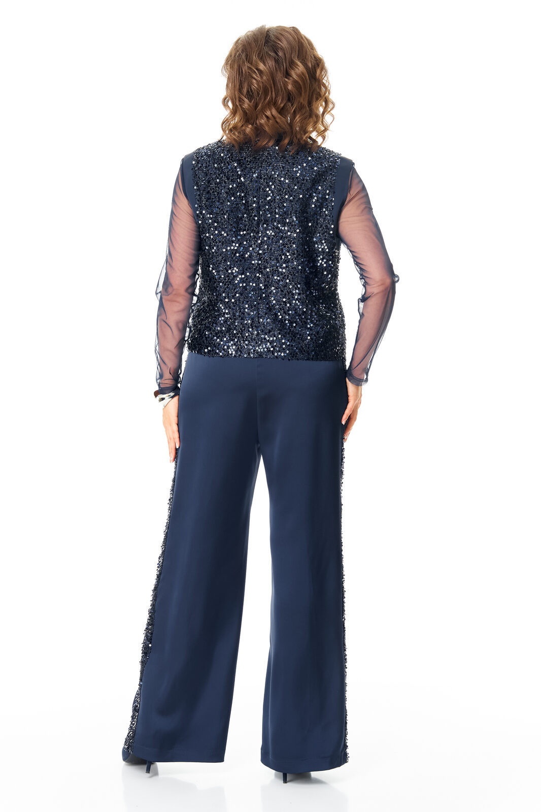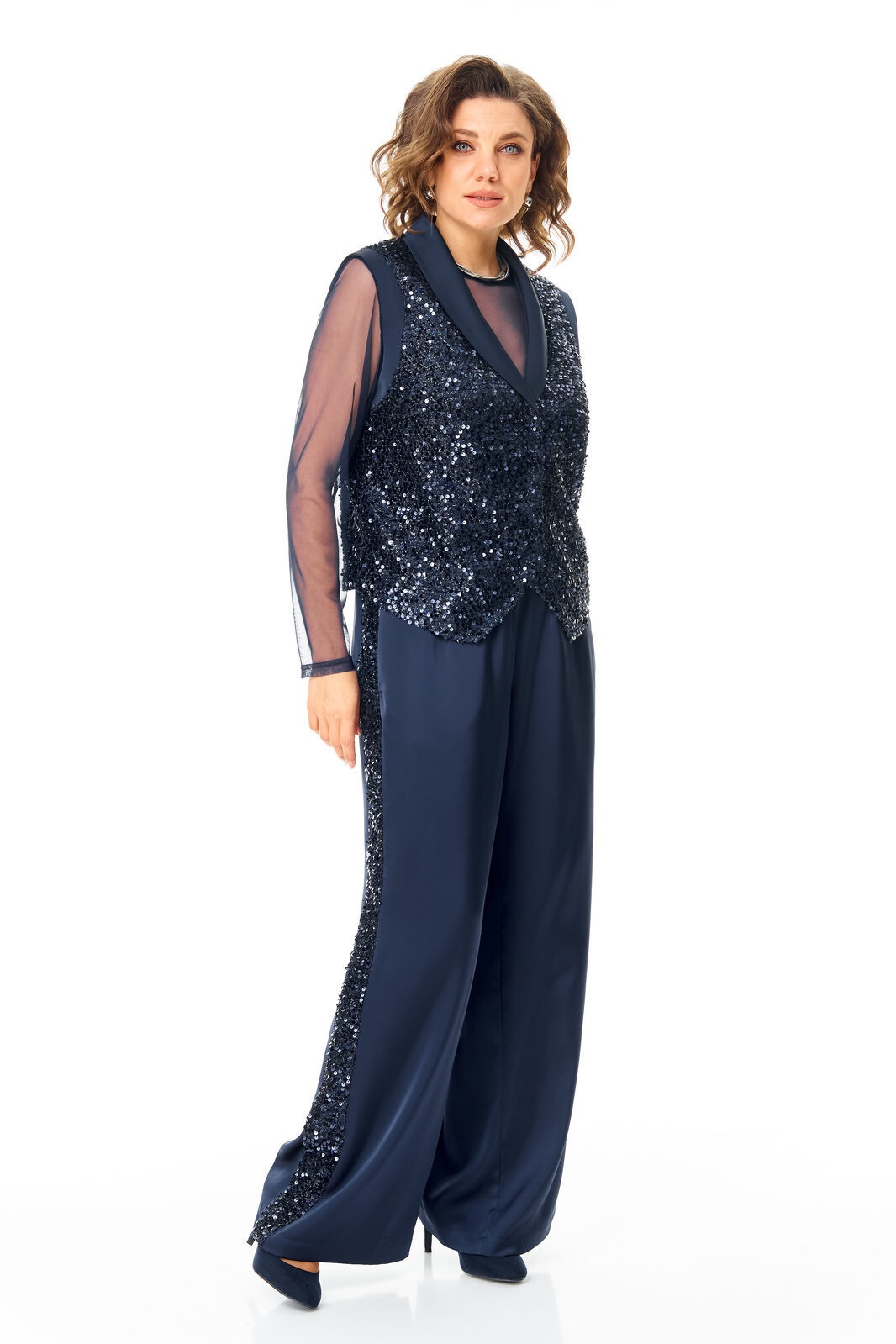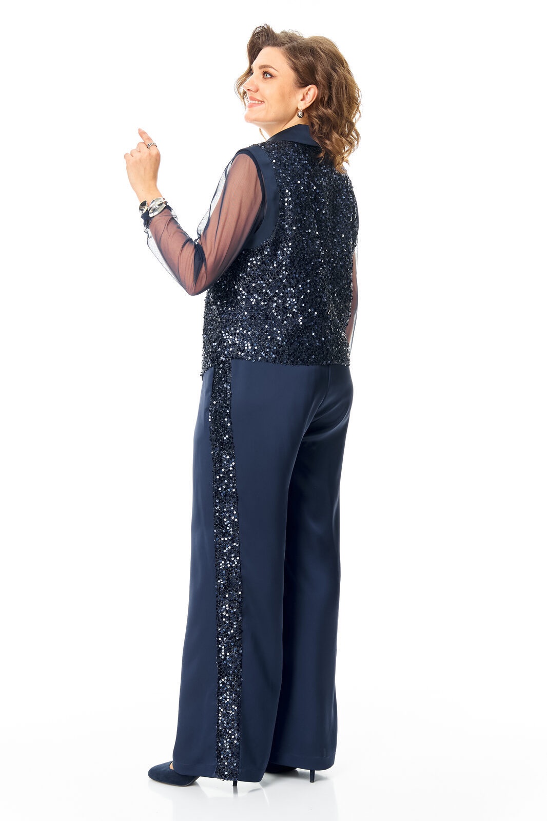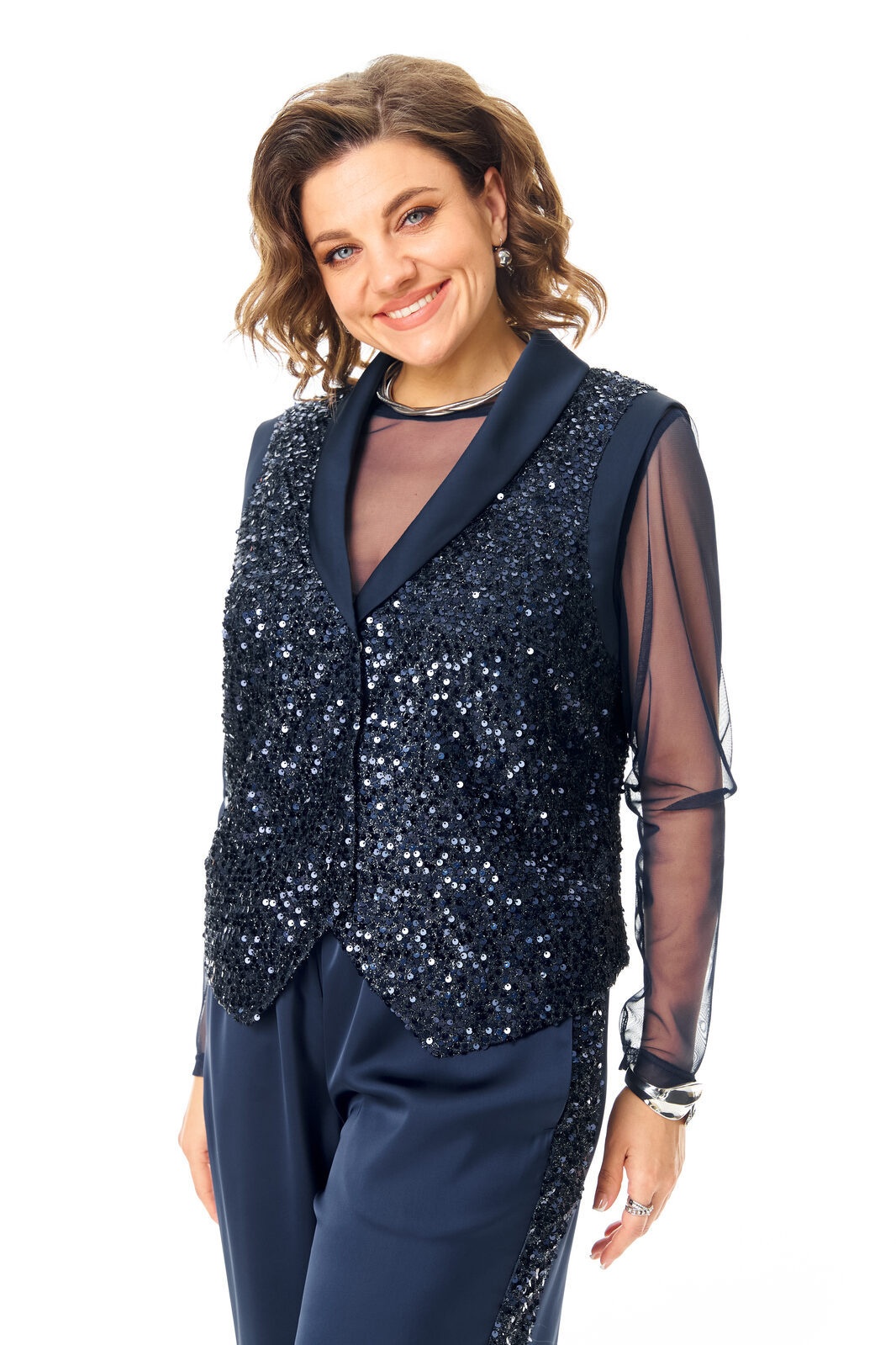 Комплект женский состоит из жилета, топа и брюк.Жилет полуприлегающего покроя на подкладке из шелковой атласной ткани.Перед и спинка выполнены из полотна с пайетками.По проймам выполнены бейки из атласной ткани.Низ жилета фигурной формы.Застёжка однобортная на потайные кнопки.Воротник отложной типа "шаль" из атласной ткани.Топ свободного покроя из полотна сетка.Горловина округлой формы, окантована.Рукав длинный. Брюки свободные расширенного силуэта.По бокам выполнены лампасы из полотна с пайетками.Пояс притачной на резинке.В боковых швах карманы.