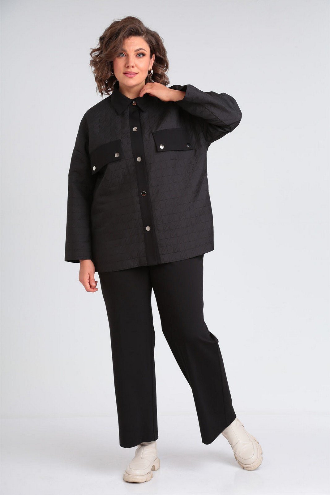 Комплект женский двухпредметный состоящий из жакет+брюки. Жакет выполнен из стеганой костюмной ткани с отделкой из трикотажа, брюки выполнены из трикотажной ткани. Жакет свободного силуэта, по переду настрочены отделочный клапаны, воротник рубашечного кроя, застежка на кнопки, в боковых швах разрезы. Брюки прямого силуэта, в боковых швах карманы, пояс брюк на резинке с регулирующим шнуром.