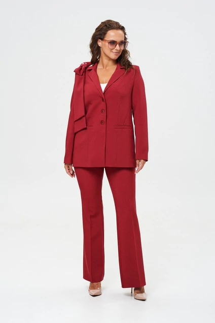 Костюм женский двухпредметный, состоящий из жакета и брюк. Жакет полуприлегающего силуэта со съёмным бантом, с застёжкой на 3 петли-пуговицы до линии перегиба лацкана. Перед с талиевой вытачкой, фигурным подрезом и карманом с листочкой. Спинка со средним швом, заканчивающимся шлицей. Рукава двухшовные втачные. Локтевой шов заканчивается открытой шлицей. Воротник пиджачного типа. По шлицам рукавов и спинки проложены 3 паралельные отделочные строчки. Жакет на подкладке. Брюки клёш (облегают бёдра и расширены умеренно к низу). Застёжка в средних срезах передних половинок брюк на короткую тесьму - молнию и 3 петли-пуговицы по широким кокеткам, которыми обработан верхний срез изделия. По передним и задним половинкам заутюжены канты. Длина жакета по спинке - 70,5 см. Длина рукава - 61 см. Длина брюк по боковому шву от верха до низа - 102 см.
