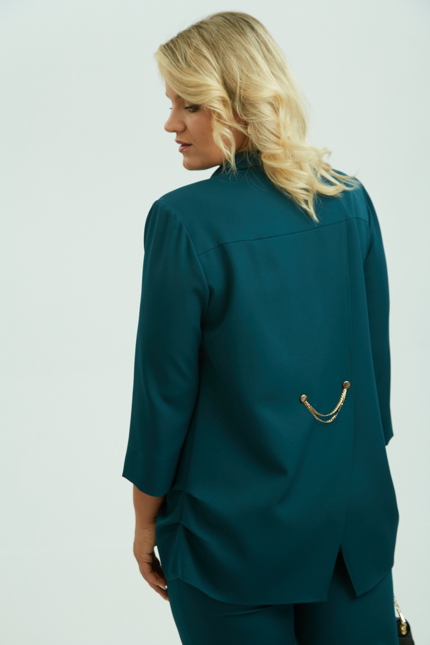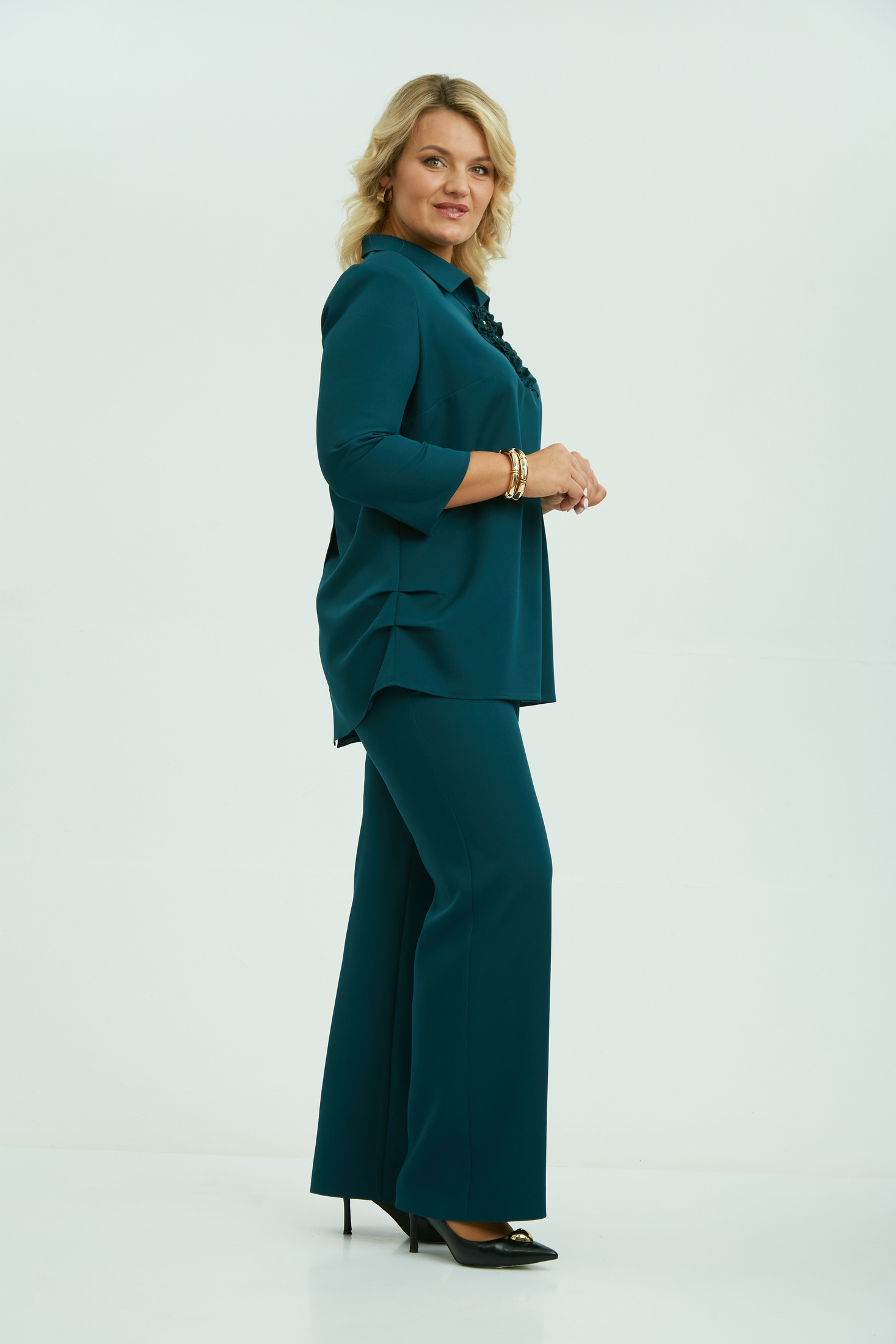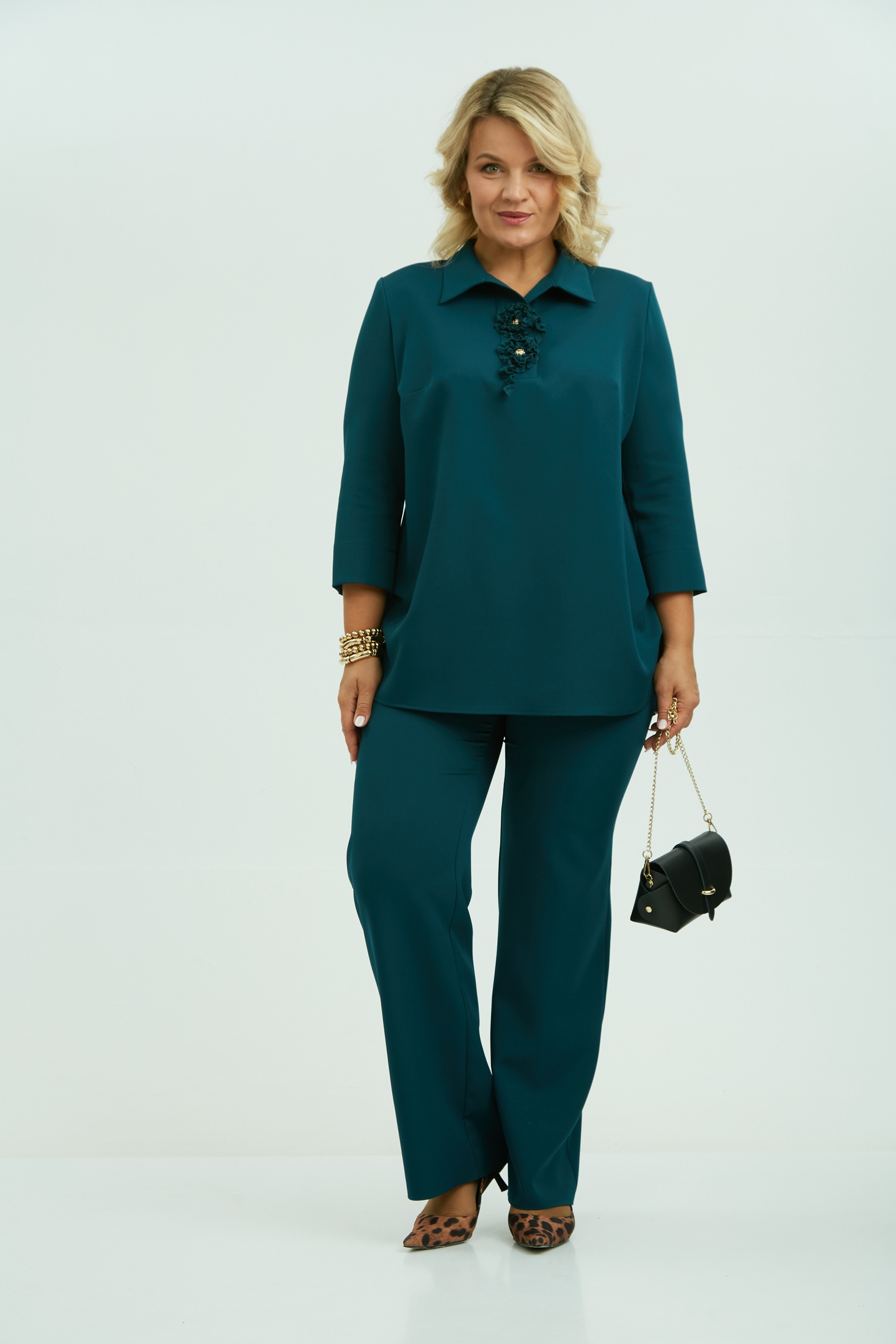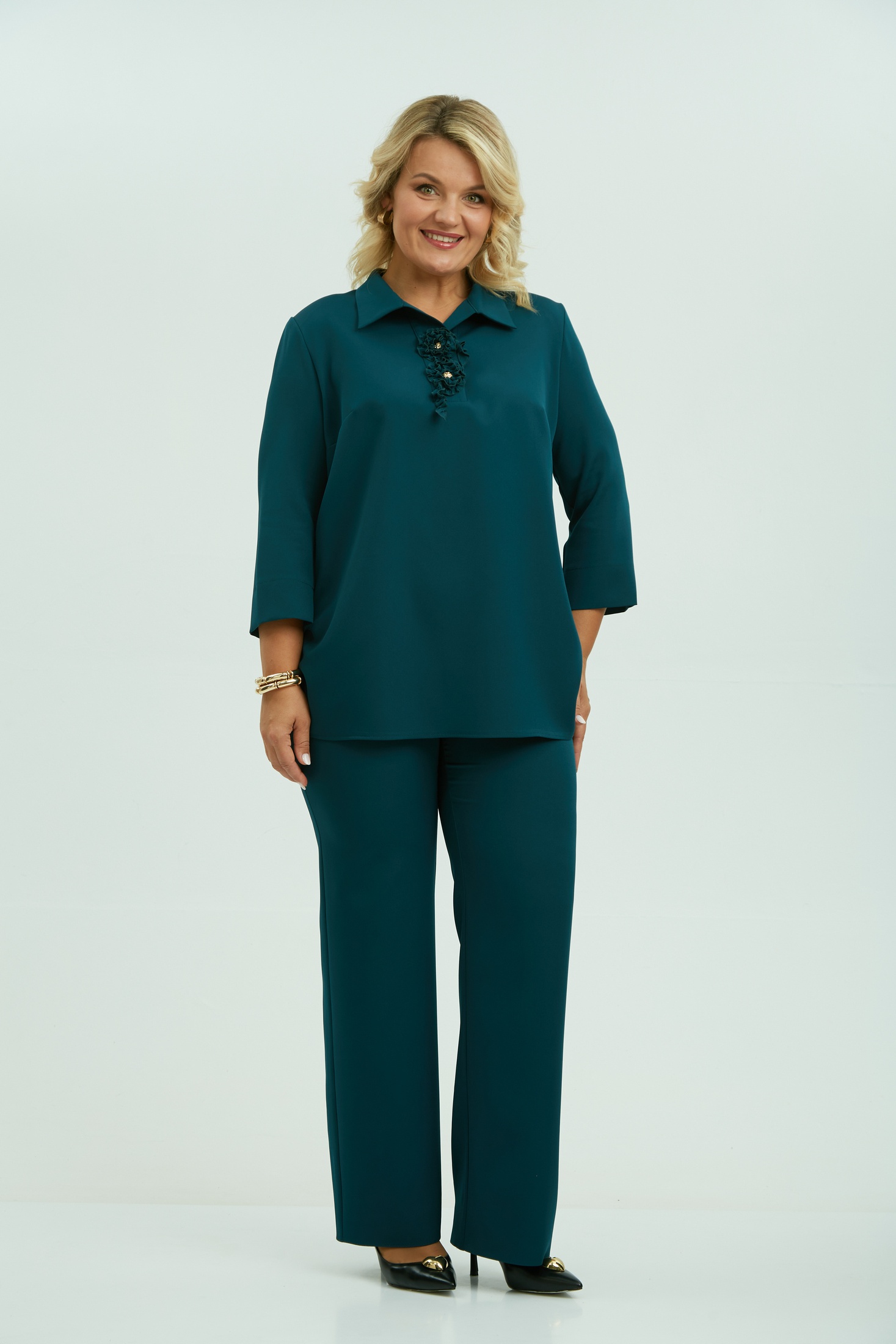 Костюм женский двухпредметный, состоящий из туники и брюк. Туника прямого силуэта со складками в боковых швах, нагрудными вытачками, выходящими из боковых швов, и застежкой на планке на 2 петли-пуговицы, деворированной двумя рюшами-розами. Воротник отложной. Спинка с горизонтальной кокеткой, нижние отлетные детали спинки фигурной формы на запах, декорированные пуговицами с цепочкой. Рукав втачной прямой одношовный длиной 3/4. Брюки прямого кроя с заутюженными стрелками и с притачным поясом от середины передних половинок с резинкой вкруговую. Застежка на тесьму-молнию и 1 петлю-пуговицу по поясу.