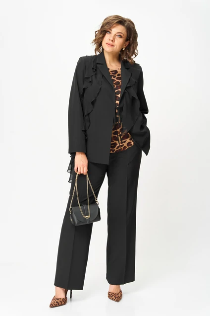 Костюм женский трехпредметный, состоящий из жакета, блузки и брюк. Жакет полуприлегающего силуэта, скомбинированный из двух видов ткани с центральной бортовой застежкой встык на завязки с фигурным подрезом из горловины и до бокового шва. Жакет с ассиметричными вставками из шифона в виде воланов. По правой части переда шифон с 3 складками вставлен по плечевому шву, частично по горловине и ниспадает из пройм. Второй волан вставлен в рельефный подрез, имеет разную ширину и не доходя до бокового шва ниспадает сходя на нет шлейфом. По левой части переда шифоновый волан фигурной формы вставлен в плечевой шов, горловину, и ниспадает на нет. Спинка со средним швом. Рукав втачной длинный двухшовный. Брюки классического кроя, прямые, с заутюженными кантами, с притачным поясом сзади на резинке и боковыми карманами с отрезным бочком. Застежка на тесьму-молнию в средних срезах передних половинок брюк.