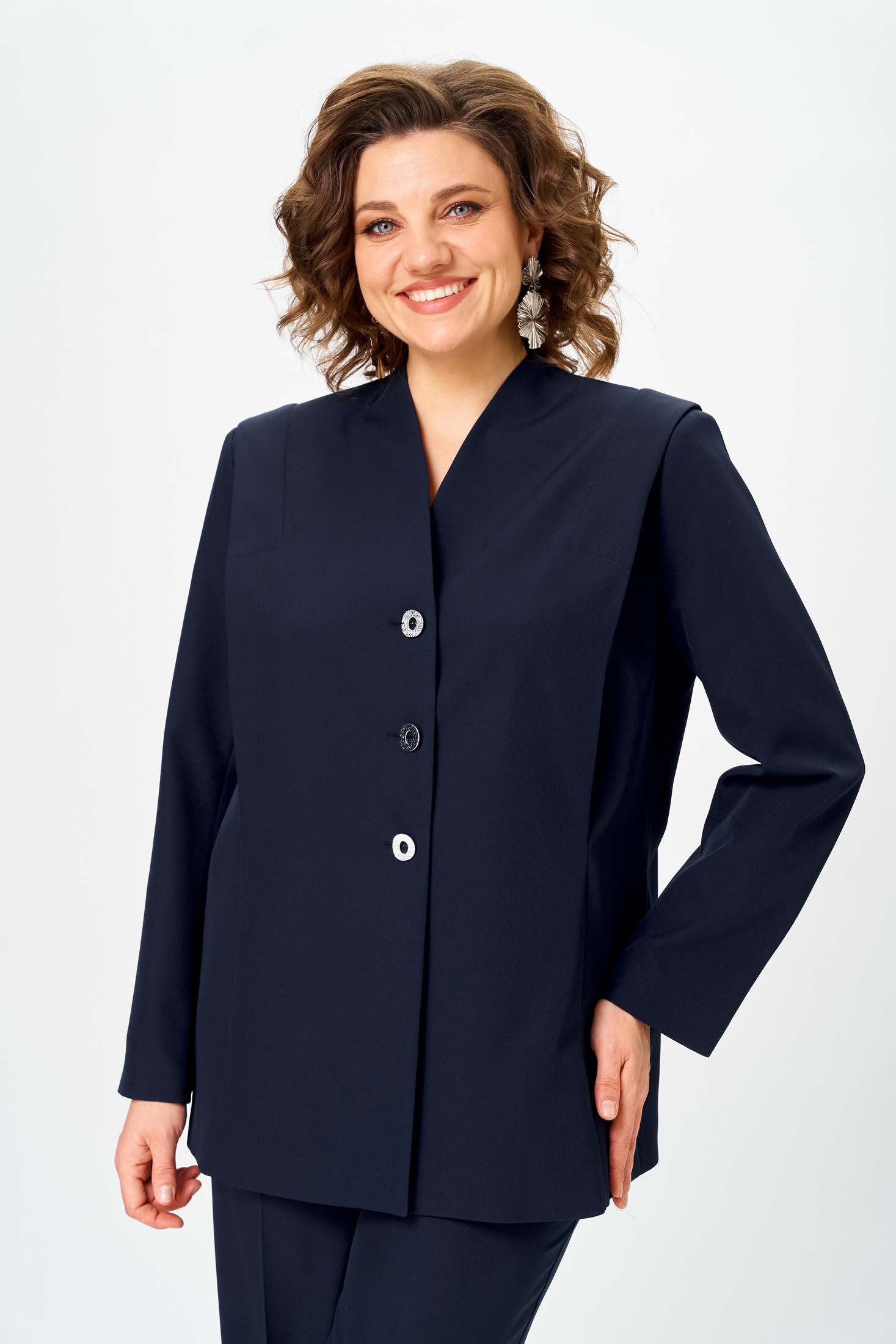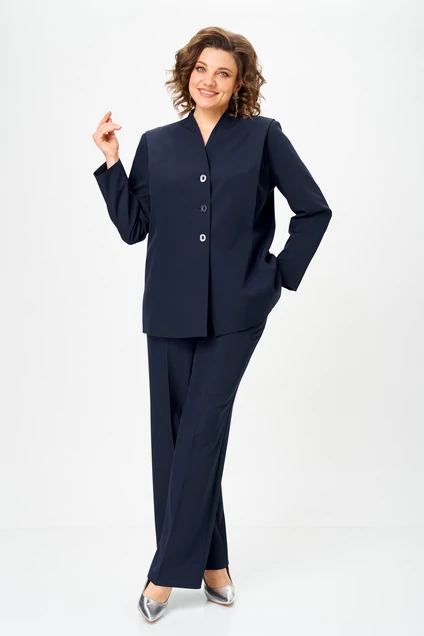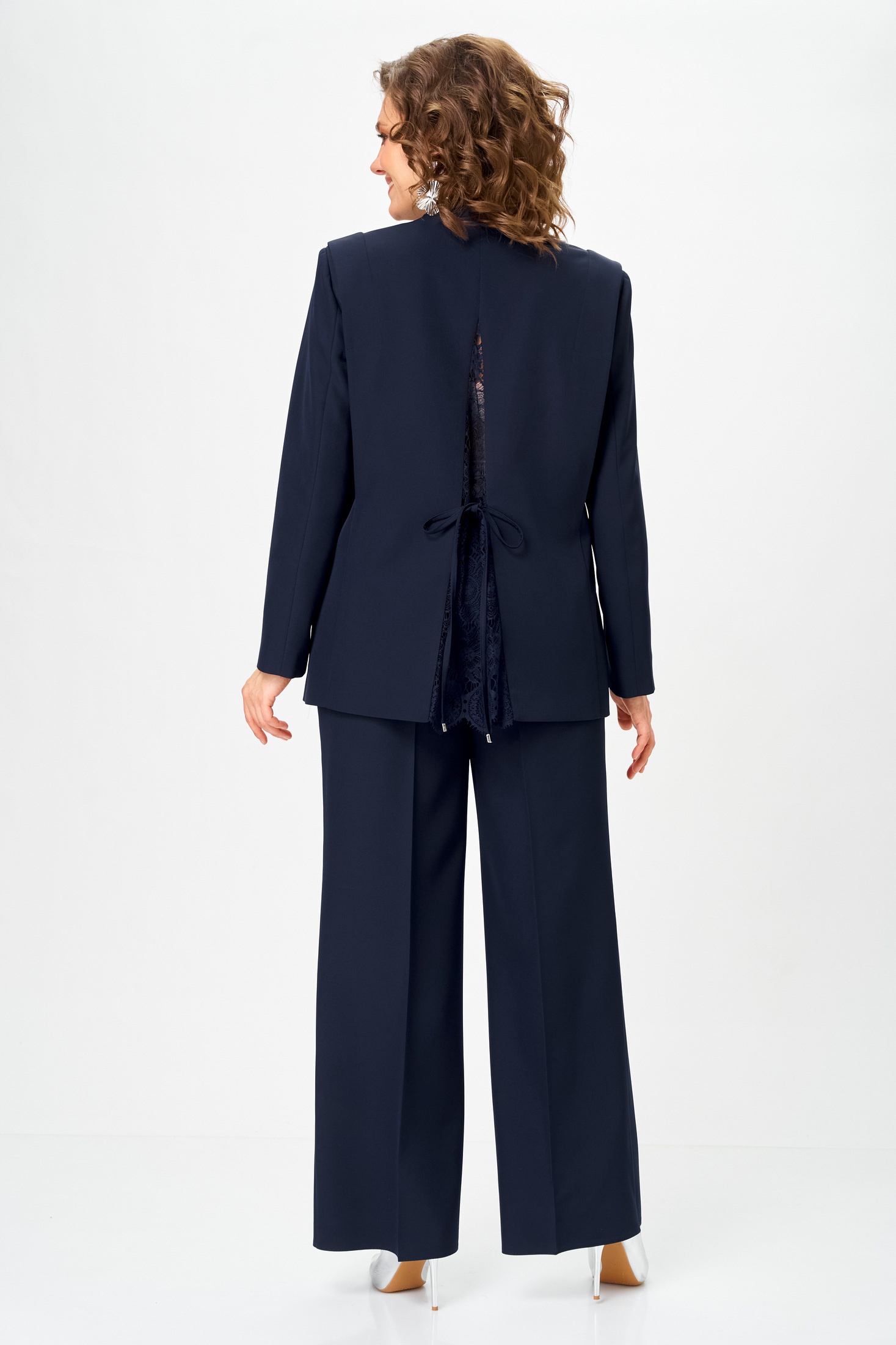 Костюм брючный 1138 темно-синий Vilena — это воплощение стиля и комфорта. Коллекция бренда Vilena предлагает женский костюм, состоящий из жакета и брюк. Жакет полуприлегающего силуэта с уникальными отлетными деталями и кружевной вставкой на спинке, которые создают изысканный контраст. Длинные втачные рукава и застежка на пуговицы подчеркивают его классическую форму. Брюки палаццо с притачным поясом и резинкой сзади обеспечивают комфорт и свободу движений, а полоска-молния и карманы добавляют практичности. Изготовленный из полиэстера с добавлением вискозы и спандекса, костюм подходит для демисезонной носки, обеспечивая комфорт в любое время года. Темно-синий цвет и классический стиль делают его идеальным для офиса и деловых встреч.