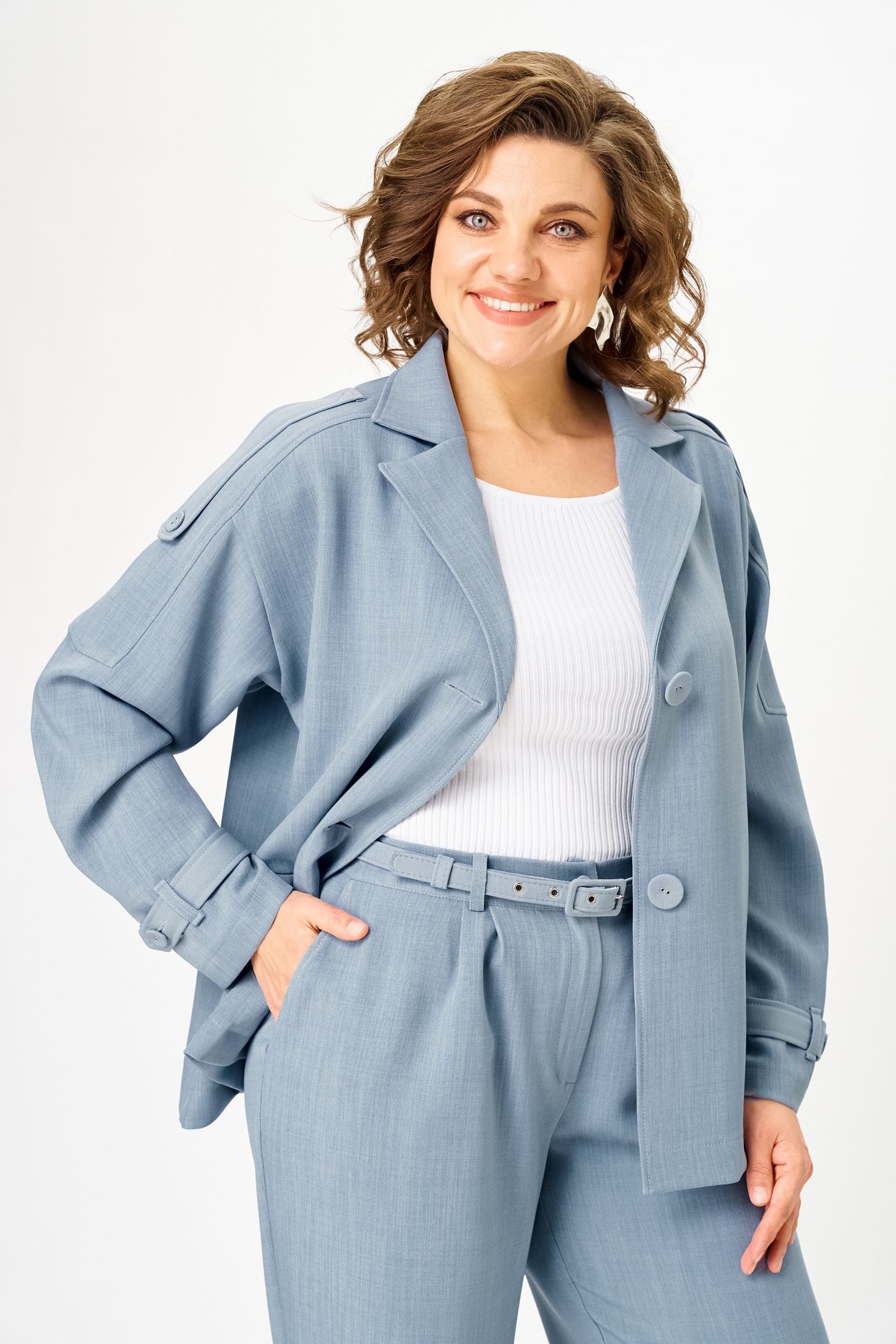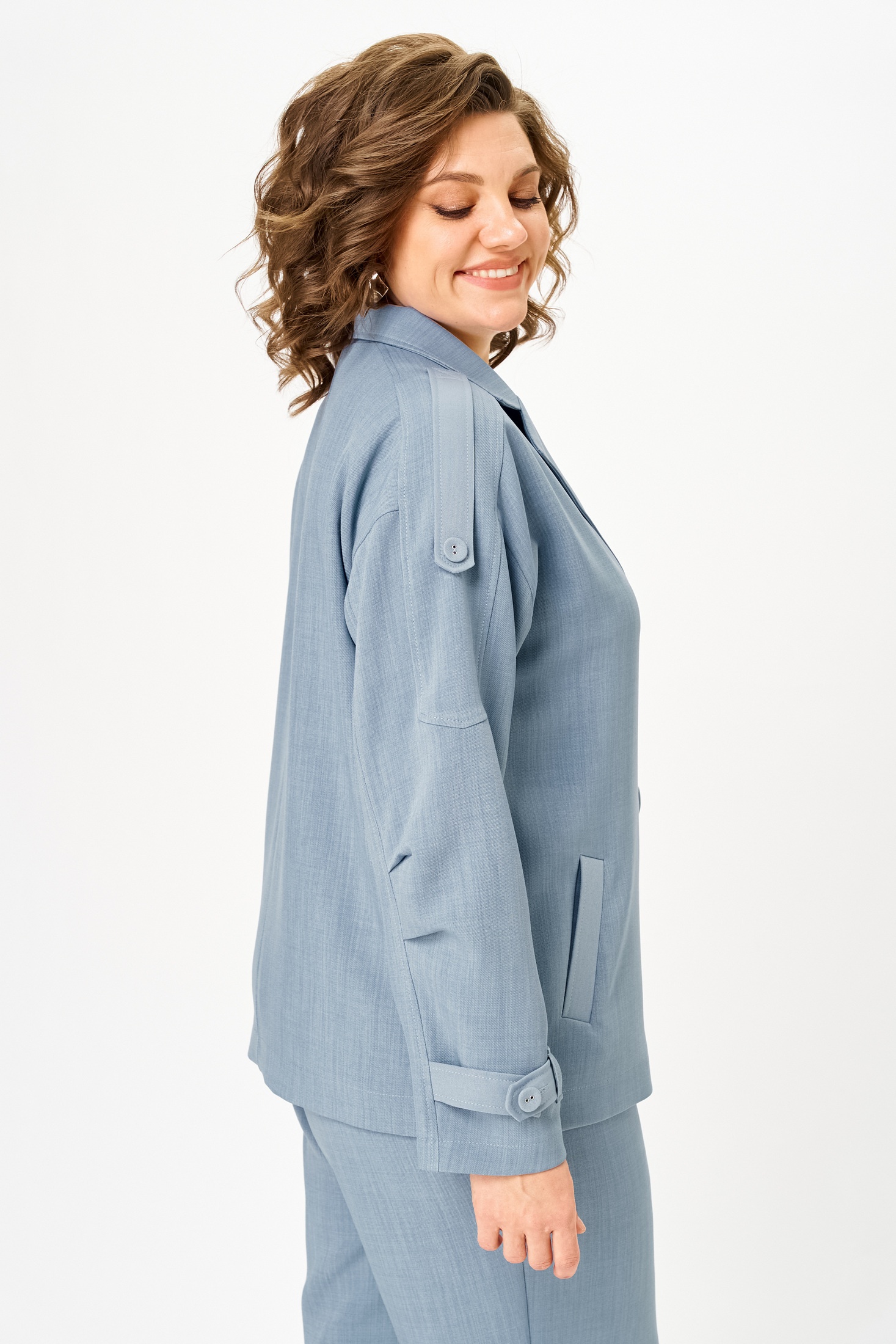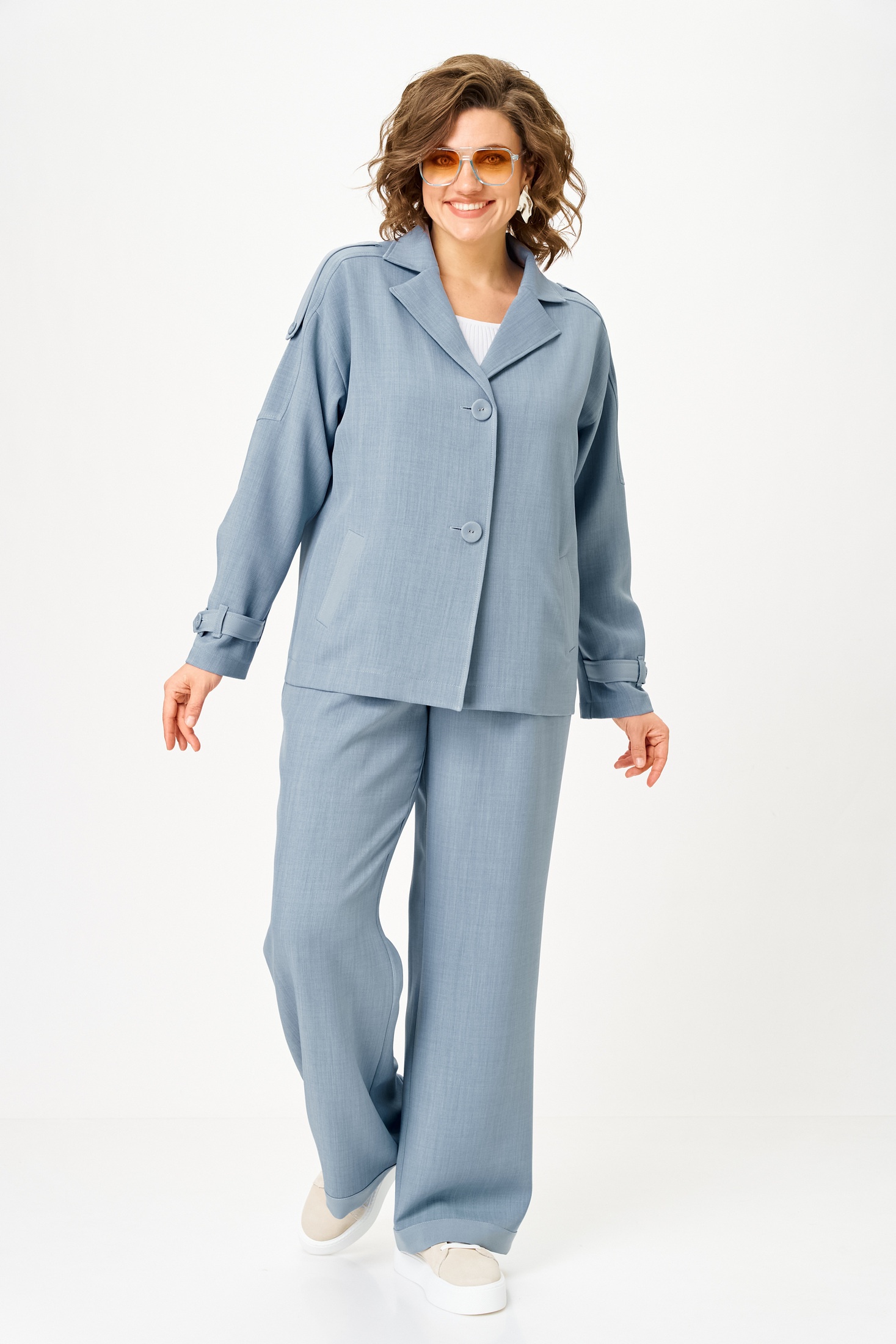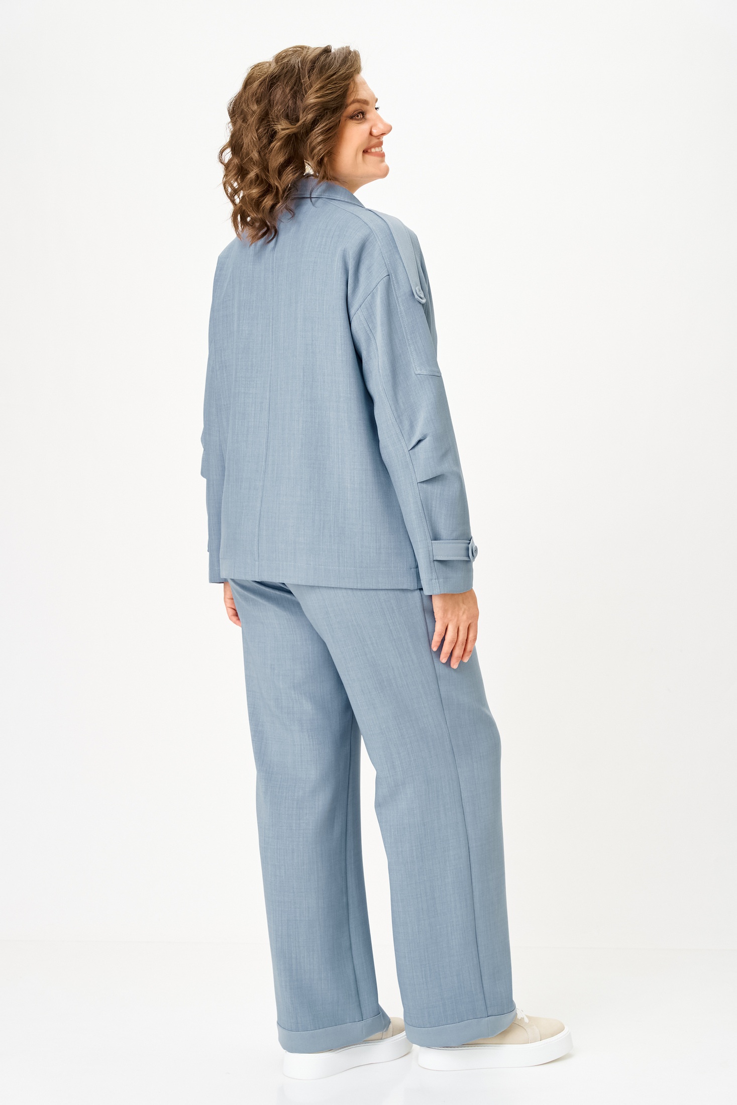 Костюм женский без подкладки, состоящий из жакета и брюк. Жакет свободного силуэта с центральной бортовой застежкой на 2 петли-пуговицы до линии перегиба лацкана. Перед с карманами с листочкой. Изделие со спущенной линией плеча и настроченным фигурным подрезом с патой на 1 пуговицу. Спинка со средним швом. Рукав рубашечного кроя, двухшовный, с двумя складками по локтевому шву и патами со шлевкой на 1 петлю-пуговицу по низу передней части рукава. Брюки прямого кроя с двумя складками, притачным поясом сзади на резинке. В изделии обработаны карманы с наклонным входом в карман. Пояс со шлевками для съемног ремня, обтянутого тканью. Низ изделия оформлен изнаночной тканью наверх. Ткань изделия - двусторонняя. Паты, листочки, пояс, подгибка низа брюк, обтачка, пуговицы выполнены в другой тональности.