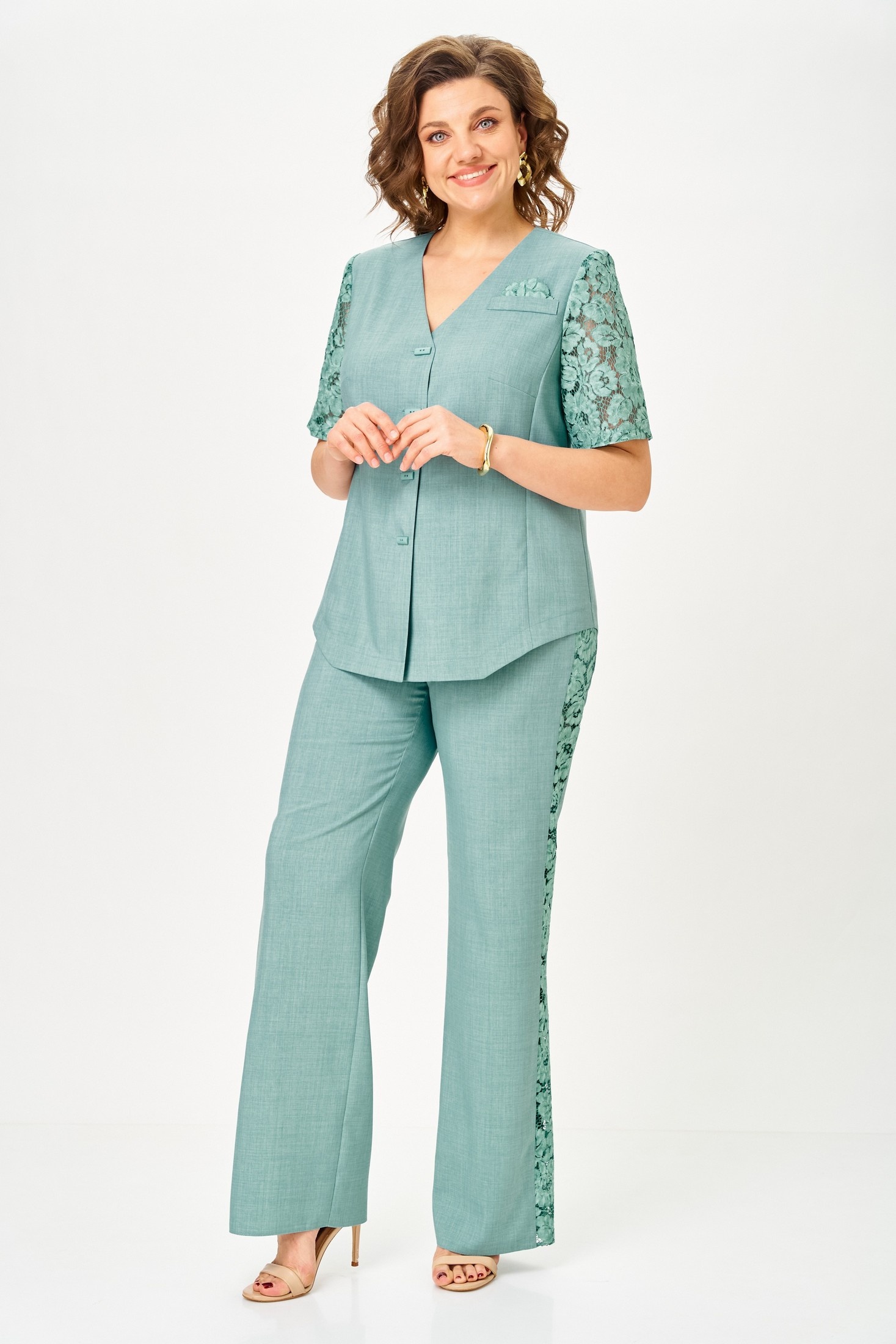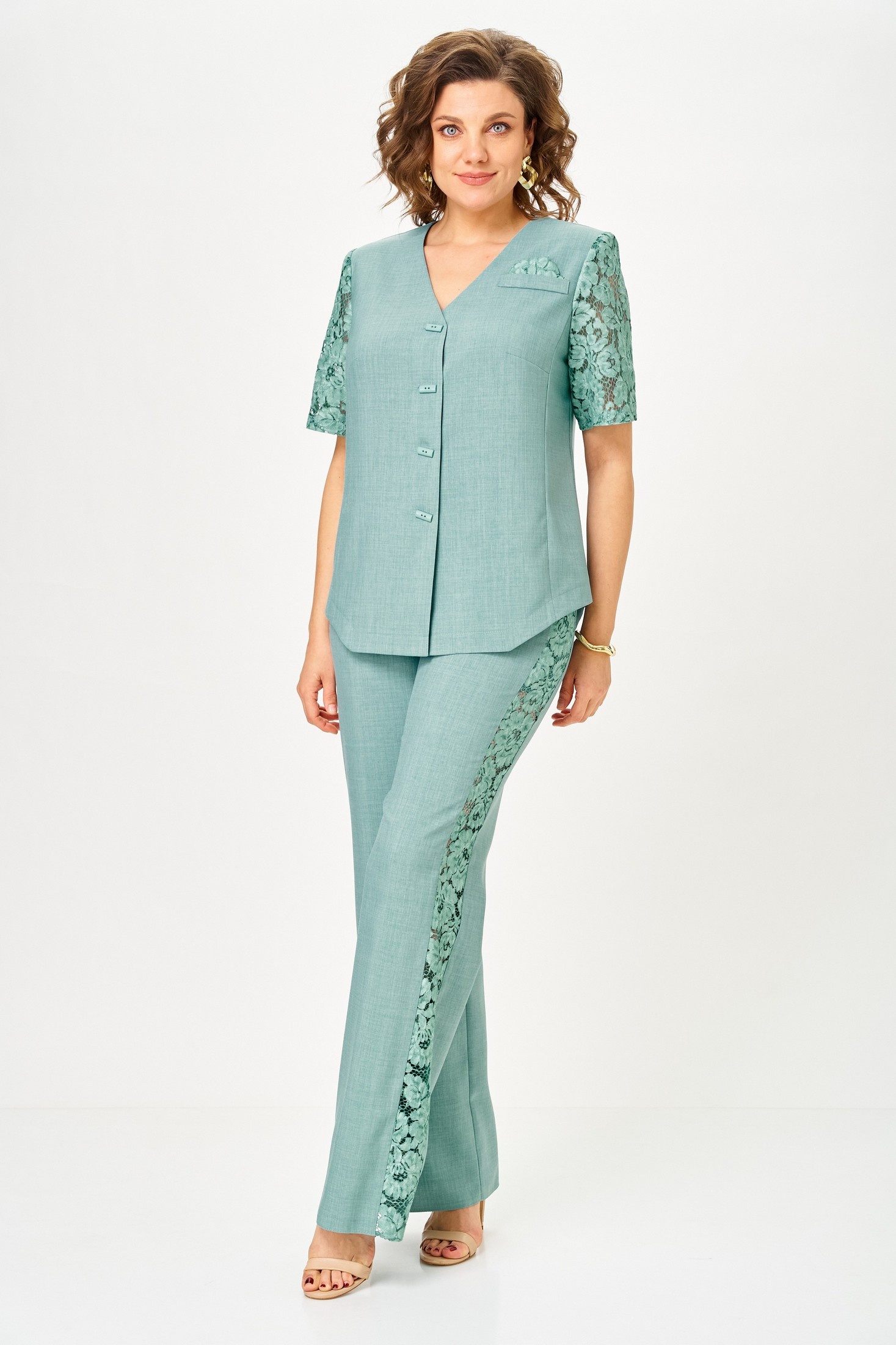 Костюм брючный 1151 полынь Vilena — это стильный и функциональный выбор для вашего гардероба. Коллекция бренда Vilena предлагает элегантный двухпредметный комплект, состоящий из жакета и брюк. Выполненный из лена, полиэстера и спандекса, костюм обеспечивает комфорт и хорошую посадку. Жакет полуприлегающего силуэта с V-образным вырезом обладает центральной застежкой на пуговицы и декоративной кружевной отделкой на рукавах. Классические брюки с притачным поясом и кружевными вставками вдоль боковых швов создают элегантный образ. Пастельный полынный цвет идеально подойдет для весенне-летнего сезона и подчеркивает нежность стиля. Этот костюм станет отличным решением для деловых встреч или вечерних прогулок.