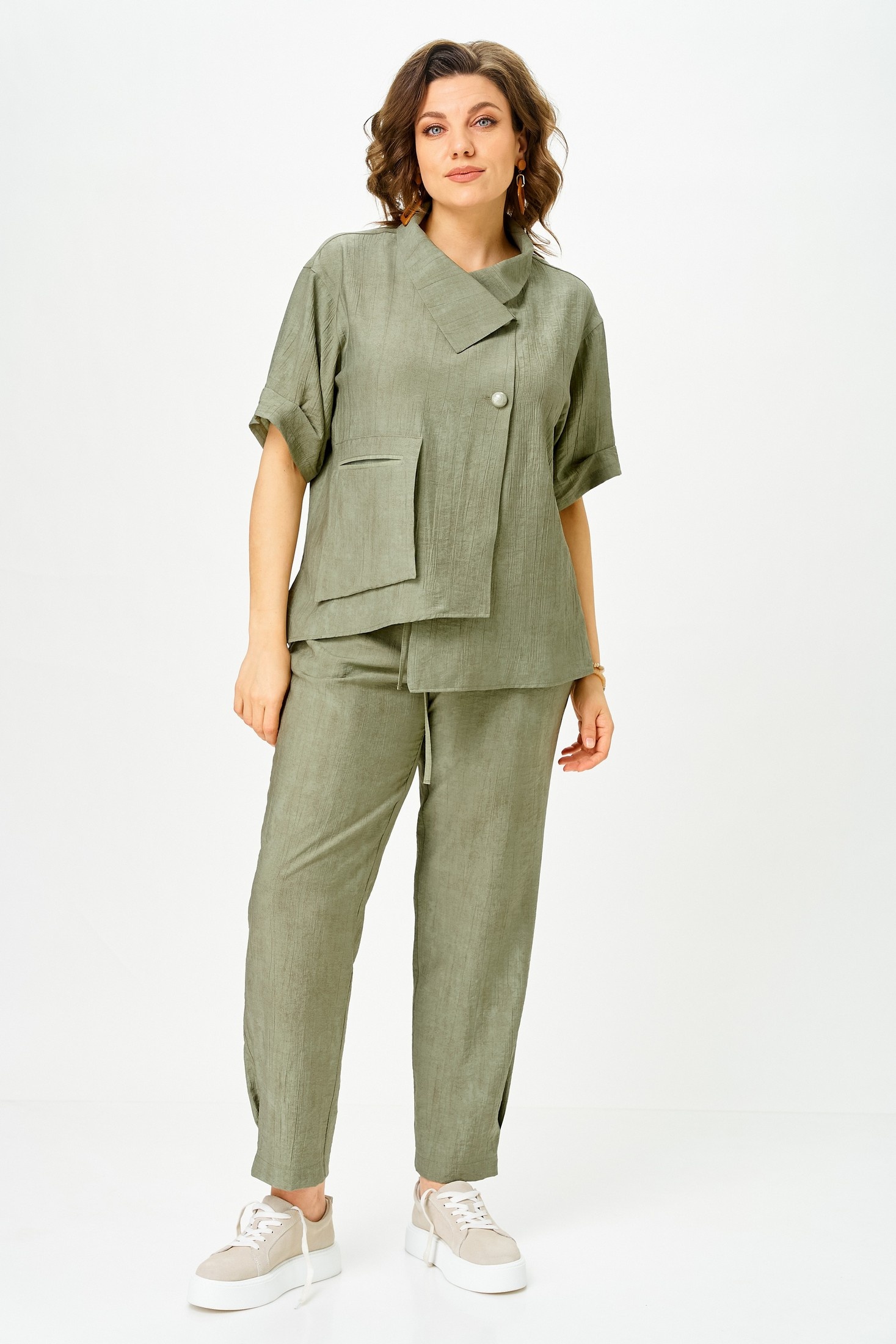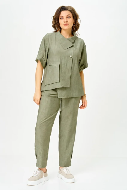 Костюм брючный 1153 хаки Vilena — это универсальный и стильный выбор для вашего гардероба. Коллекция бренда Vilena предлагает элегантный женский двухпредметный костюм, состоящий из блузы и брюк. Изготовленный из мягкой вискозы с добавлением нейлона, костюм обеспечивает комфорт в повседневной носке. Блуза оснащена смещенной застежкой и асимметричным низом, придавая индивидуальность вашему образу. Короткие рукава со складкой и декоративный карман добавляют изысканности. Брюки с классическим кроем и эластичным поясом удобны и практичны для офисного или повседневного стиля. Оливковый цвет делает этот костюм идеальным выбором для весны и осени. Разрезы и карманы завершают образ, акцентируя внимание на функциональности.