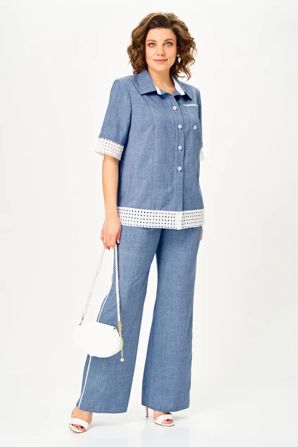 Костюм брючный 1156 голубой Vilena — это стильный выбор для модных и практичных женщин. Коллекция бренда Vilena предлагает женственный двухпредметный комплект, включающий жакет и брюки. Жакет свободного кроя с застежкой на пуговицы и декоративными деталями в виде накладного кармана и кружевной отделки. Короткий одношовный рукав и цельная спинка с кокеткой добавляют изысканности. Брюки прямого кроя с кантами и резинкой на поясе обеспечивают комфорт и свободу движений. Комплект выполнен из смеси льна, полиэстера и спандекса, что делает его идеальным для летних и весенних дней. Голубой цвет костюма придает свежесть и элегантность вашему образу.