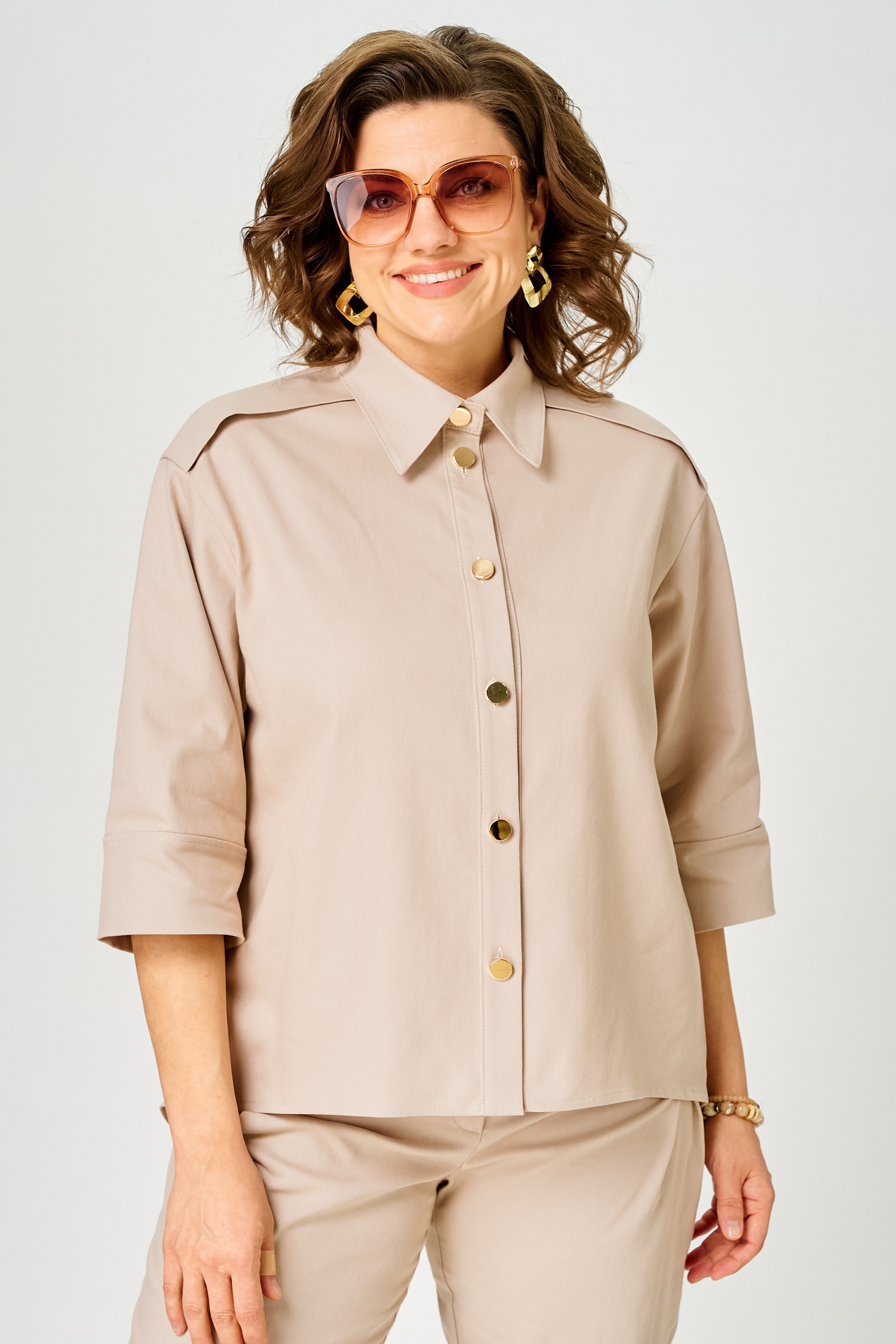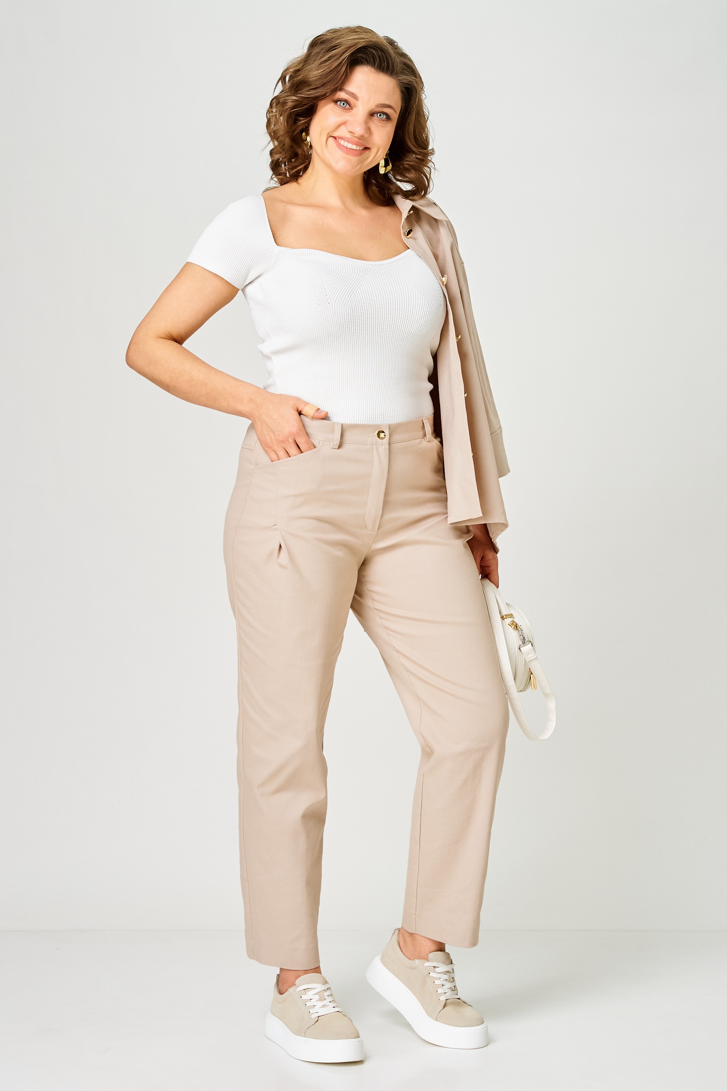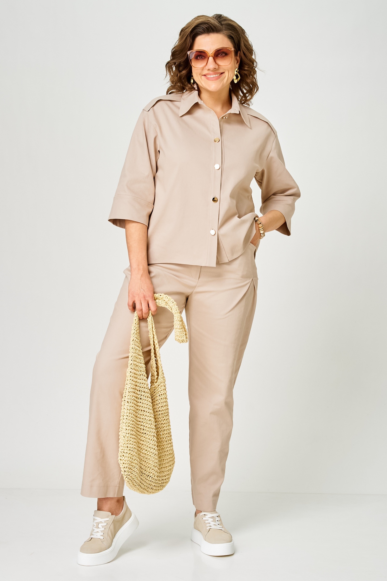 Костюм брючный 1158 песок Vilena предлагает гармоничное сочетание стиля и утонченности. Коллекция бренда Vilena выполнена из мягкого и комфортного материала, сочетающего 72% хлопка, 26% полиэстера и 2% эластана, что обеспечивает превосходную воздухопроницаемость и свободу движений. Фасон включает элегантную блузу с застежкой на пуговицы и брюки с притачным поясом на резинке. Дизайн дополнен спущенной линией проймы и изящной складкой на спинке. Костюм выполнен в стильном бежевом цвете и подходит для офисного и повседневного использования в весенне-летний сезон. Особенности включают одношовные рукава длиной ¾ и фигурные карманы, добавляющие комфорт и практичность.