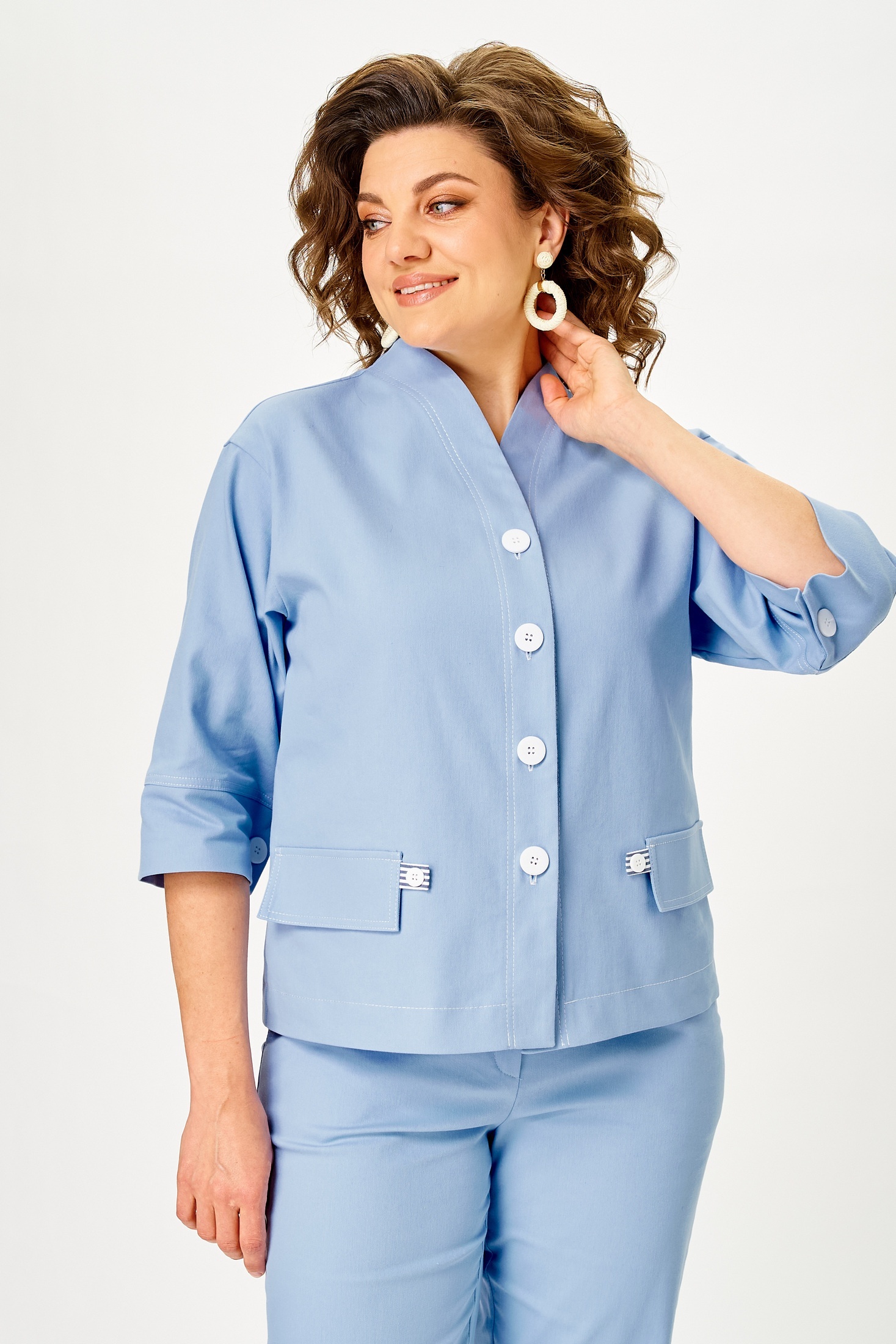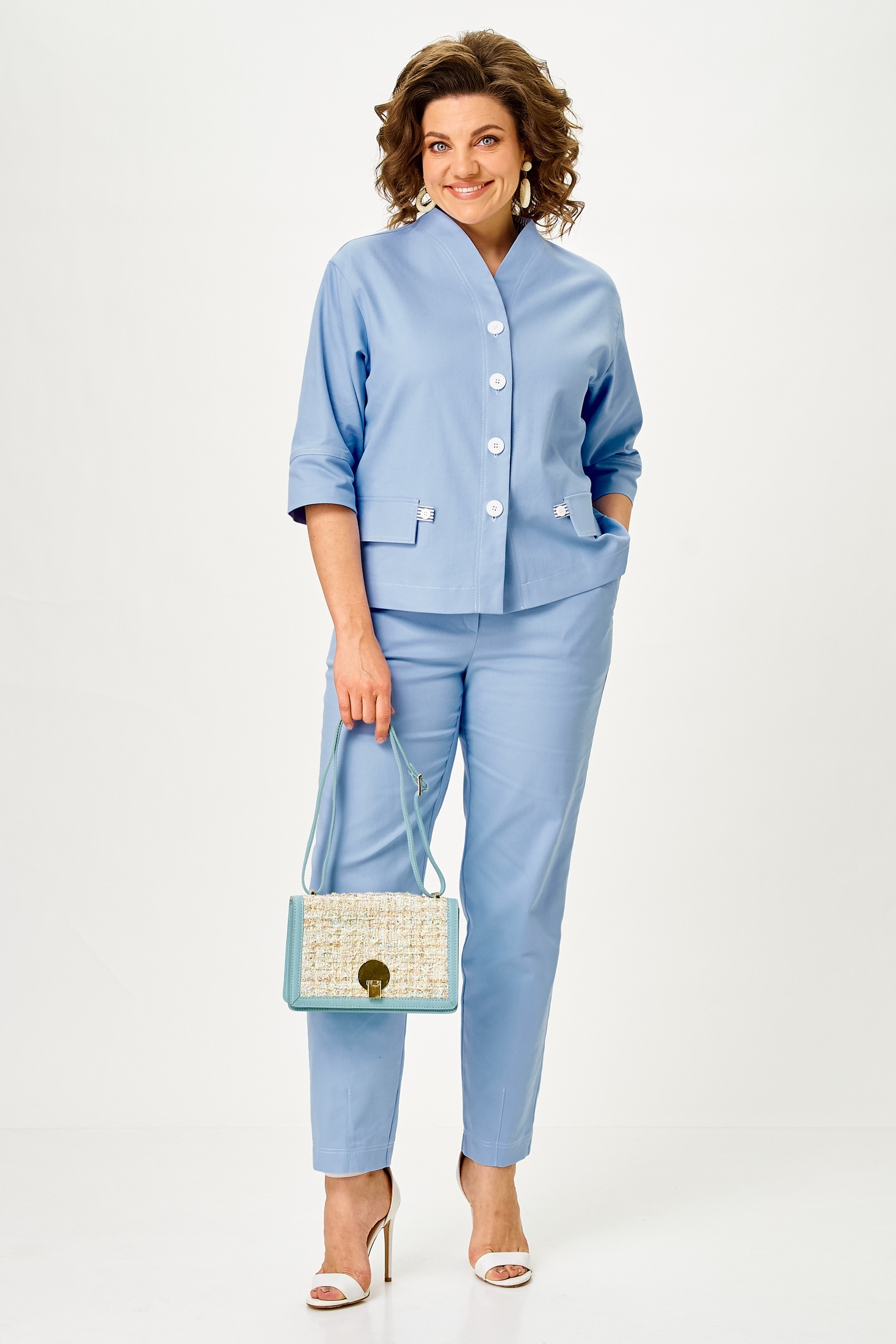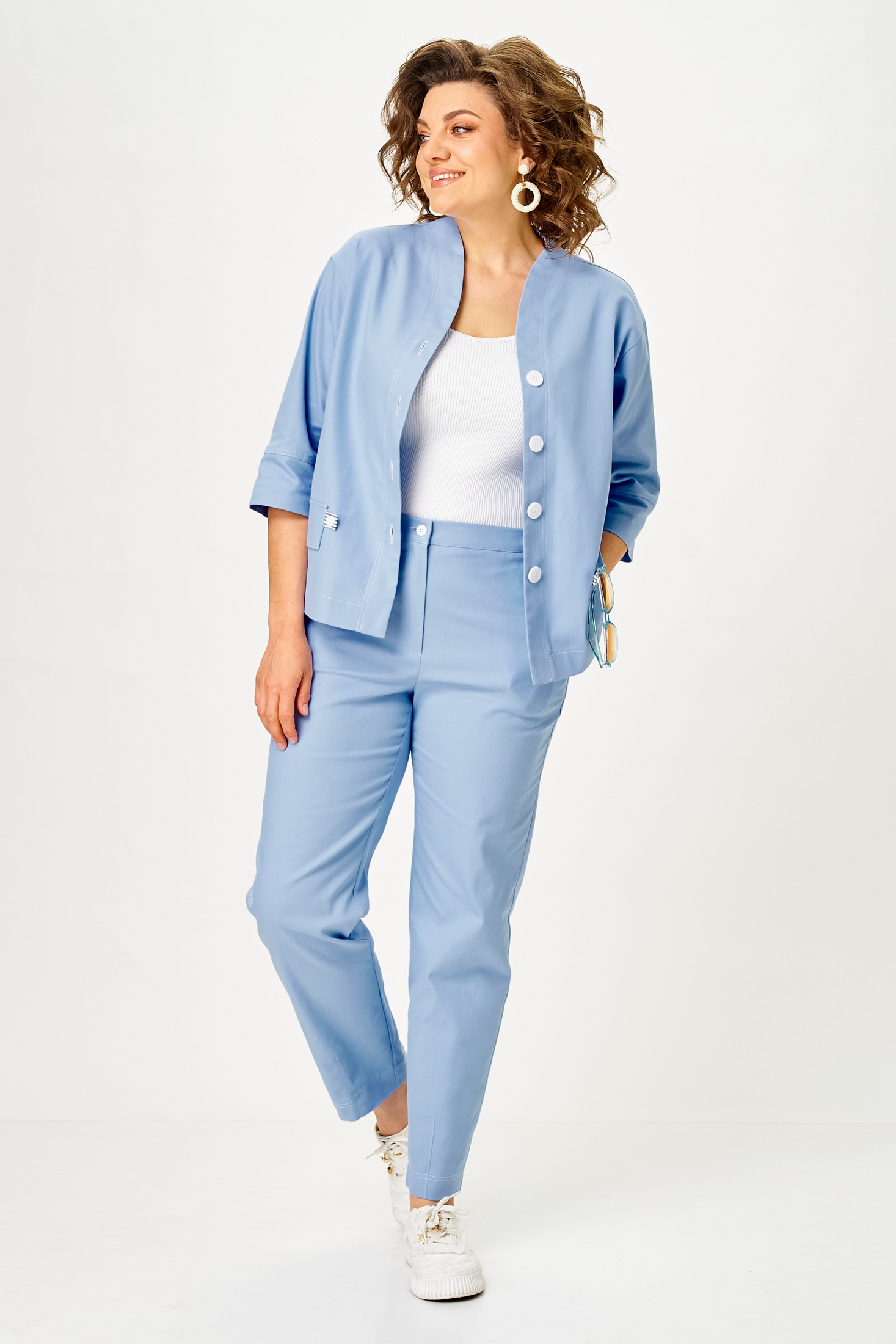 Костюм брючный 1159 голубой Vilena — идеальный выбор для стильных женщин. Коллекция бренда Vilena представляет женский двухпредметный костюм из жакета и брюк, выполненный из мягкого хлопка с добавлением полиэстера и эластана для оптимального комфорта и свободы движений. Светло-голубой цвет подчеркивает утонченность и легкость образа. Жакет прямого силуэта оснащен центральной застежкой на пуговицы и цельнокройной стойкой, а рукава 3/4 длины создают эффектный акцент. Зауженные брюки с наклонными карманами и резинкой на поясе украсят ваш офисный гардероб. Этот костюм без подкладки идеально подойдет для весенне-летнего сезона — для работы и повседневных встреч.