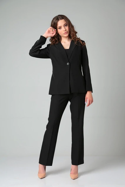Костюм женский 2-х предметный состоит из жакета на подкладке и брюк. Жакет полуприлегающего силуэта с однобортной застёжкой на 1 петлю и 1 пуговицу, с воротником пиджачного типа. Перед с рельефными швами, спинка со средним швом. Рукав двухшовный, втачной с отлётной шлицей по низу локтевого шва. С декоративным поясом - завязкой в боковых швах. Брюки с застёжкой на тесьму "молнию", гульфик и откосок, с притачным поясом на две петли и 2 пуговицы, с карманами наклонными к боковым швам. По передним и задним половинкам застрочены вытачки и заутюжены канты. Длина жакета по спинке - 66 см. Длина рукава - 60 см. Длина брюк по передней части - 98 см.