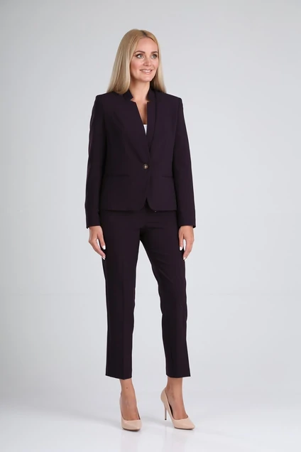 Элегантный женский 2-х предметный костюм состоит из жакета на подкладке и брюк. Жакет с однобортной застежкой на 1 петлю и 1 пуговицу. Перед с рельефными швами от проймы до низа и талиевыми вытачками, входящими в прорезной карман "в рамку". Спинка со средним швом и рельефными швами от проймы до низа. Рукав втачной двухшовный с открытой шлицей в локтевом шве, длинный. Жакет с отрезными лацканами и воротником с прямыми углами. Брюки слегка заужены к низу, с карманами, наклонными к боковым швам, с притачным поясом, с застежкой на тесьму-"молнию" в среднем шве передних половинок брюк. Передние и задние половинки с заутюженными кантами. Длина жакета по спинке - 58 см. Длина рукава - 61 см. Длина брюк - 89 см.