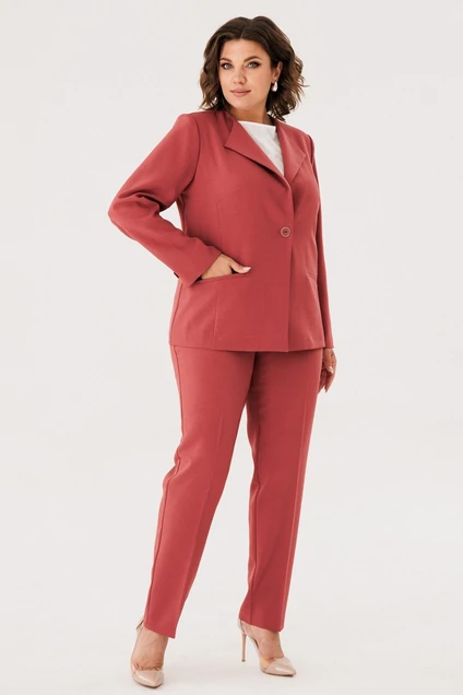 Костюм женский трёхпредметный, состоящий из жакета, брюк и блузы. Жакет полуприлегающего силуэта без подкладки с центральной бортовой застёжкой на 1 петлю-пуговицу до линии перегиба лацкана. Детали переда с отрезными бочками, нагрудными вытачками, выходящими из бочка и прорезными карманами с листочкой. Спинка со средним швом. Рукава втачные двухшовные. Локтевые швы заканчиваются открытыми шлицами с 1 пуговицей. Брюки слегка зауженные к низу с притачным поясом на резинке по задним половинкам. Застёжка на тесьму - молнию в средних срезах передних половинок и 1 петлю-пуговицу на поясе. Блузка полуприлегающего силуэта со слегка спущенной линией проймы. Перед с нагрудными вытачками, выходящими из боковых швов и тремя защипами по 0,1 см. по центру изделия. Горловина овальной формы. Низ изделия фигурной формы. Длина жакета по спинке - 66 см. Длина блузы - 59 см. Длина рукава жакета - 61 см. Длина рукава блузы - 22 см. Длина брюк по передней части - 100 см. Блуза: Полиэстер-100%