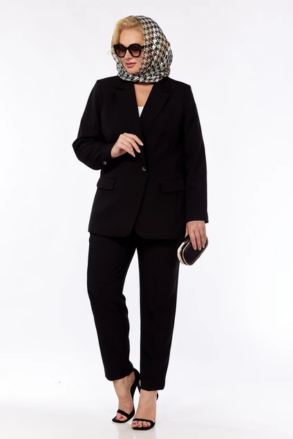 Элегантный костюм состоит из жакета на подкладке и брюк. Жакет с двубортной застежкой. Воротник пиджачного типа. Перед с талиевыми вытачками и рельефными швами от пройм до низа, с прорезными карманами в" рамку" с клапанами. Спинка со средним швом и с отлетными шлицами в рельефных швах. Рукав втачной, двухшовный, длинный с обтачными шлицами в локтевых швах. Брюки слегка зауженные книзу, на притачном поясе, на резинке по задним половинкам. Передние и задние половинки с заутюженными кантами. По передним половинкам карманы, выполненные под наклонам к боковым швам, и декоративный клапан. Длина жакета 70 см, длина рукава 61 см, длина брюк 96 см.