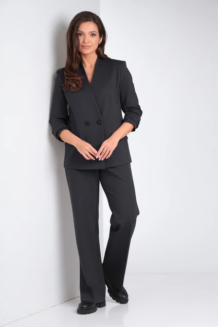 Костюм женский 2-х предметный полуприлегающего силуэта, состоит из жакета и брюк из комфортного трикотажа. Жакет без подкладки, с двубортной застёжкой на 2 петли и 2 пуговицы, цельнокроенным воротником-стойкой. Перед с нагрудными вытачками в рельефных швах от пройм до низа, с притачным клапаном имитирующим карман. Спинка со средним швом. Рукав втачной, двухшовный, длинный. Брюки прямые от колена, с застёжкой на тесьму "молнию" в средних срезах передних половинок, гульяик и откосок. С притачным поясом на резинке по задним половинкам, застёгивающимся на 1 петлю и 1 пуговицу. По передним и задним половинкам заутюженные канты. Длина жакета по спинке - 64 см. Длина рукава - 61 см. Длина брюк по боковому шву - 101,5 см.