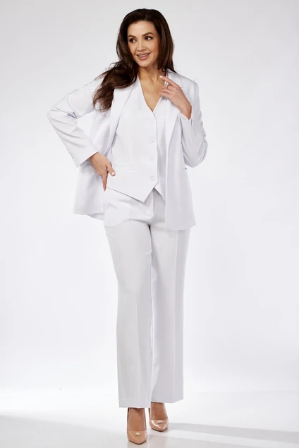 Костюм женский 3-х предметный, полуприлегающего силуэта. Состоит из жакета и жилета на подкладке и брюк. Жакет с воротником пиджачного типа, центральной застёжкой на 1 петлю и 1 пуговицу. Перед с рельефными швами от пройм до низа и талиевыми вытачками и прорезными карманами с листочками с втачными концами. Спинка со средним швом. Рукав втачной, двухшовный, длинный со шлицей. Жилет с рельефными швами от пройм до низа по переду и спинке, с центральной застёжкой на 4 петли и 4 пуговицы. Перед с прорезными карманами с листочками с втачными концами. Брюки с застёжкой на тесьму "молнию" в средних срезах передних половинок, с притачным поясом на 1 петлю и 1 пуговицу и резинкой по задним половинкам, с карманами наклонными к боковым швам. По передним и задним половинкам заутюженные канты. Длина жакета по спинке - 70 см. Длина рукава - 61 см. Длина жилета по спинке - 53 см. Длина брюк по боковому шву - 101 см.