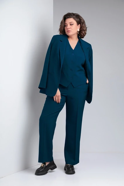 Костюм женский 3-х предметный, полуприлегающего силуэта. Состоит из жакета и жилета на подкладке и брюк. Жакет с воротником пиджачного типа, центральной застёжкой на 1 петлю и 1 пуговицу. Перед с рельефными швами от пройм до низа и талиевыми вытачками и прорезными карманами с листочками с втачными концами. Спинка со средним швом. Рукав втачной, двухшовный, длинный со шлицей. Жилет с рельефными швами от пройм до низа по переду и спинке, с центральной застёжкой на 4 петли и 4 пуговицы. Перед с прорезными карманами с листочками с втачными концами. Брюки с застёжкой на тесьму "молнию" в средних срезах передних половинок, с притачным поясом на 1 петлю и 1 пуговицу и резинкой по задним половинкам, с карманами наклонными к боковым швам. По передним и задним половинкам заутюженные канты. Длина жакета по спинке - 71 см. Длина рукава - 61 см. Длина жилета по спинке - 54 см. Длина брюк по боковому шву - 101 см.