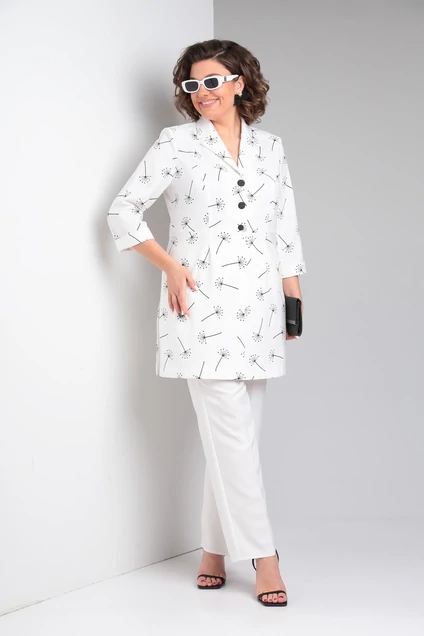 Костюм женский двухпредметный, состоящий из туники и брюк. Туника полуприлегающего силуэта с центральной бортовой застёжкой на 3 петли-пуговицы до линии перегиба лацкана и с горизонтальным подрезом в области талии. Перед с рельефными швами от проймы и до подреза. Нижняя часть переда с застроченными односторонними складками (в продолжении рельефа). Спинка со средним швом. В боковых швах обработангы разрезы. Воротник пиджачного типа. Рукав втачной одношовный с отложным манжетом до локтя. Туника без подкладки. Брюки женские классические прямого силуэта. Верхний срез брюк с притачным поясом. Брюки с застёжкой на тесьму-молнию в среднем шве передних частей и с застёжкой на петлю и пуговицу по концам пояса. Передние половинки с наклонным карманом к боковому шву. Брюки со сгибами по передним и задним частям брюк. Длина туники по спинке - 84 см. Длина рукава - 45,5 см. Длина брюк по боковому шву - 100 см.