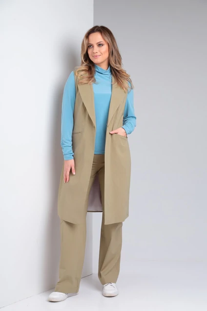 Женский костюм, состоящий из жилетки длиной 100 см и брюк карго. Жилетка на подкладке с полноценными карманами, застегивается на одну петлю-пуговицу. Брюки с притачным поясом с широкой резинкой, застежка спереди на молнию и две пуговицы по переду, сзади 2 накладных кармана вверху брюк и два настрочных кармана с клапаном по бокам, на каждой брючине в области колена. Брюки прямого кроя от бедра.