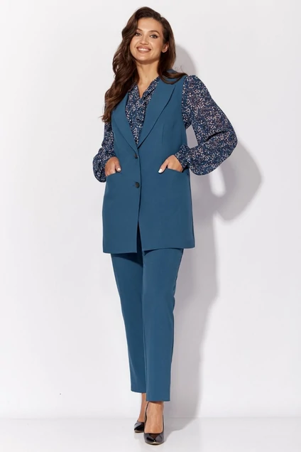 Комплект из трех предметов: жилет, брюки и блузка. Жилет полуприлегающего силуэта, застегивается на 2 пуговицы. Воротник пиджачного типа с лацканами. Спинка со средним швом и талиевыми вытачками. Жилет на подкладке. Классические брюки, зауженные книзу, с застежкой на потайную молнию и пуговицу. Пояс частично на резинке. Спереди боковые карманы. Блуза прямого кроя. Горловина V-образной формы с декоративными завязками. Рукава втачные, длинные, на манжете. Длина жилета - 79 см, длина брюк - 103 см.