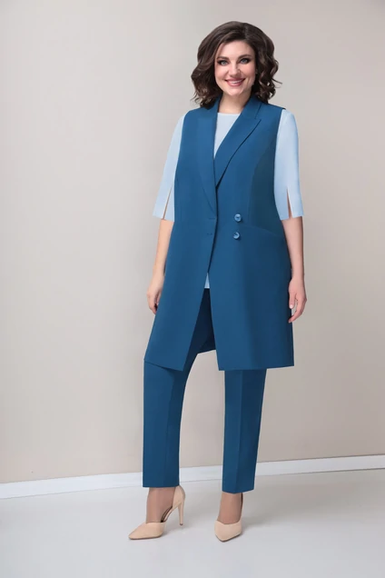 Удлиненный двубортный жилет из облегченного текстиля с ассиметричной застежкой на пуговицы. Длина жилета по центру спинки- 92см. Брюки прямые классические, с высокой посадкой, притачным поясом с резинками по бокам. Длина брюк по боковому шву- 100 см. Блуза из легкой ткани с втачным рукавом длиной 37см. Длина блузы по центру спинки- 68 см. Блуза: полиэстер 96%, спандекс 4%.