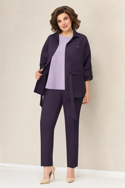 Костюм женский: жакет, брюки, блуза. Жакет на потайной застежке,с пришивной кулисой и поясом, прямые классические брюки и блуза- универсальный комплект для различных вариантов носки. Длина жакета по центру спинки- 67см. Элегантный рукав с патой на цельнокроеной основе. Брюки прямые с высокой посадкой, с притачным поясом на резинке. Длина брюк по боковому шву- 100см. Блуза из легкого текстиля с принтом, со спущенным коротким рукавом. Длина блузы по центру спинки- 62см. Блуза: полиэстер 95%, эластан 5%.